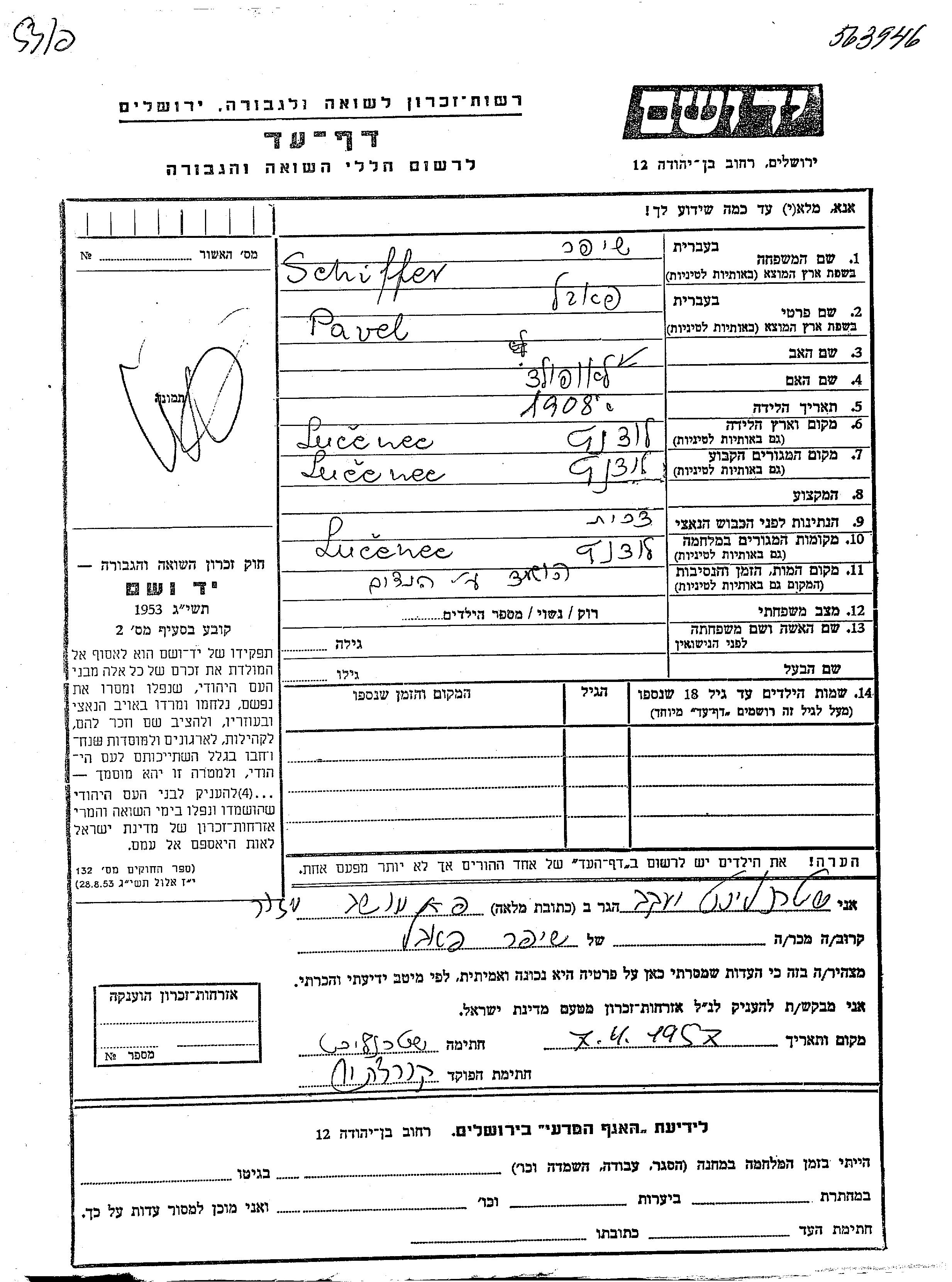 Pavel Schiffer was born in Lucenec, Czechoslovakia, 1908 to Leopold. Prior to WWII he lived in Lucenec, Czechoslovakia. During the war he was in Lucenec, Czechoslovakia. Pavel was murdered in the Shoah.