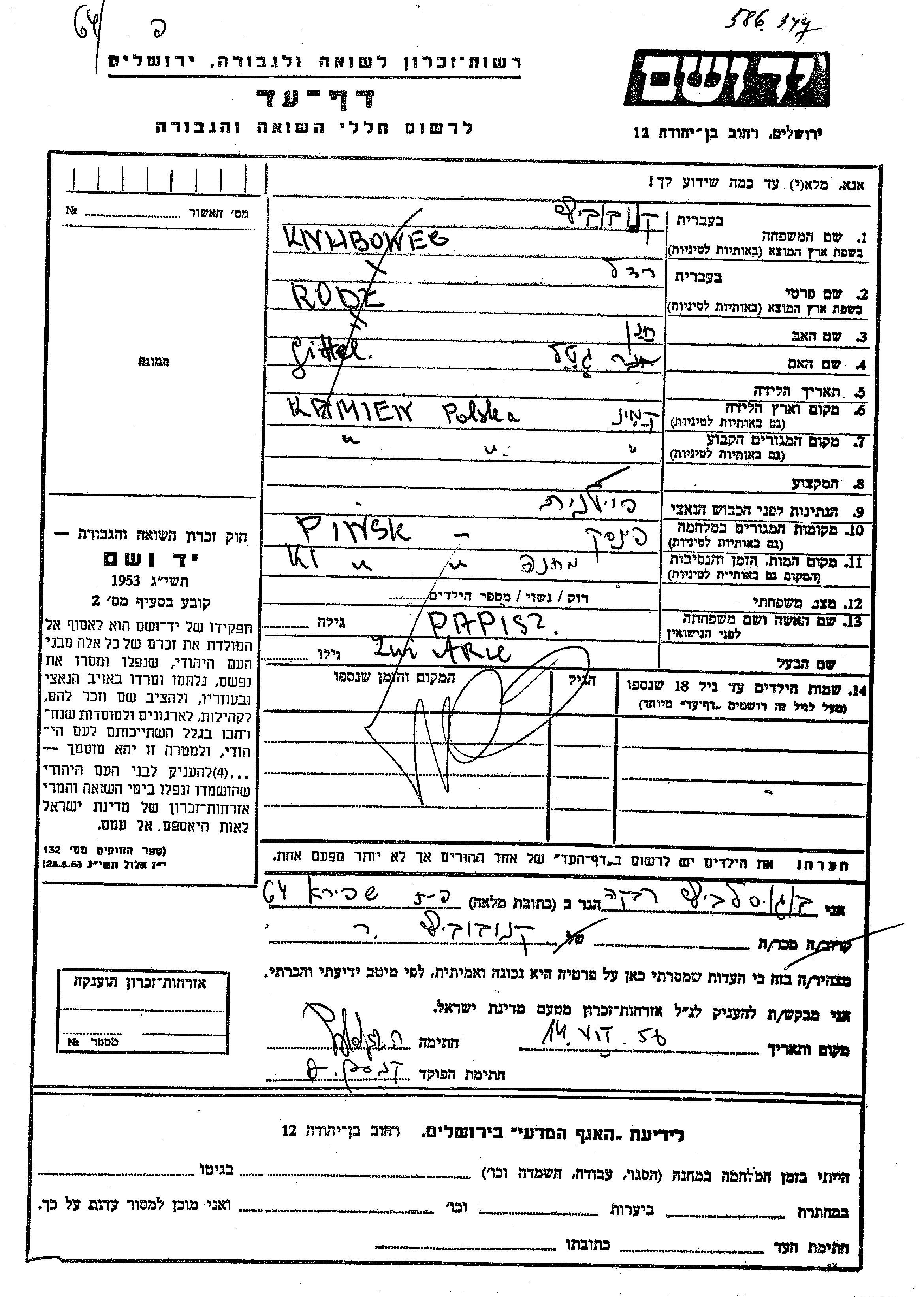 Rodl Knubowec nee Papis was born in Kamien, Poland to Khanan and Gittel. She was married to Zwi Arie. Prior to WWII she lived in Kamien, Poland. During the war she was in Pinsk, Poland. Rodl was murdered in the Shoah. Place of death: Pinsk, Poland.