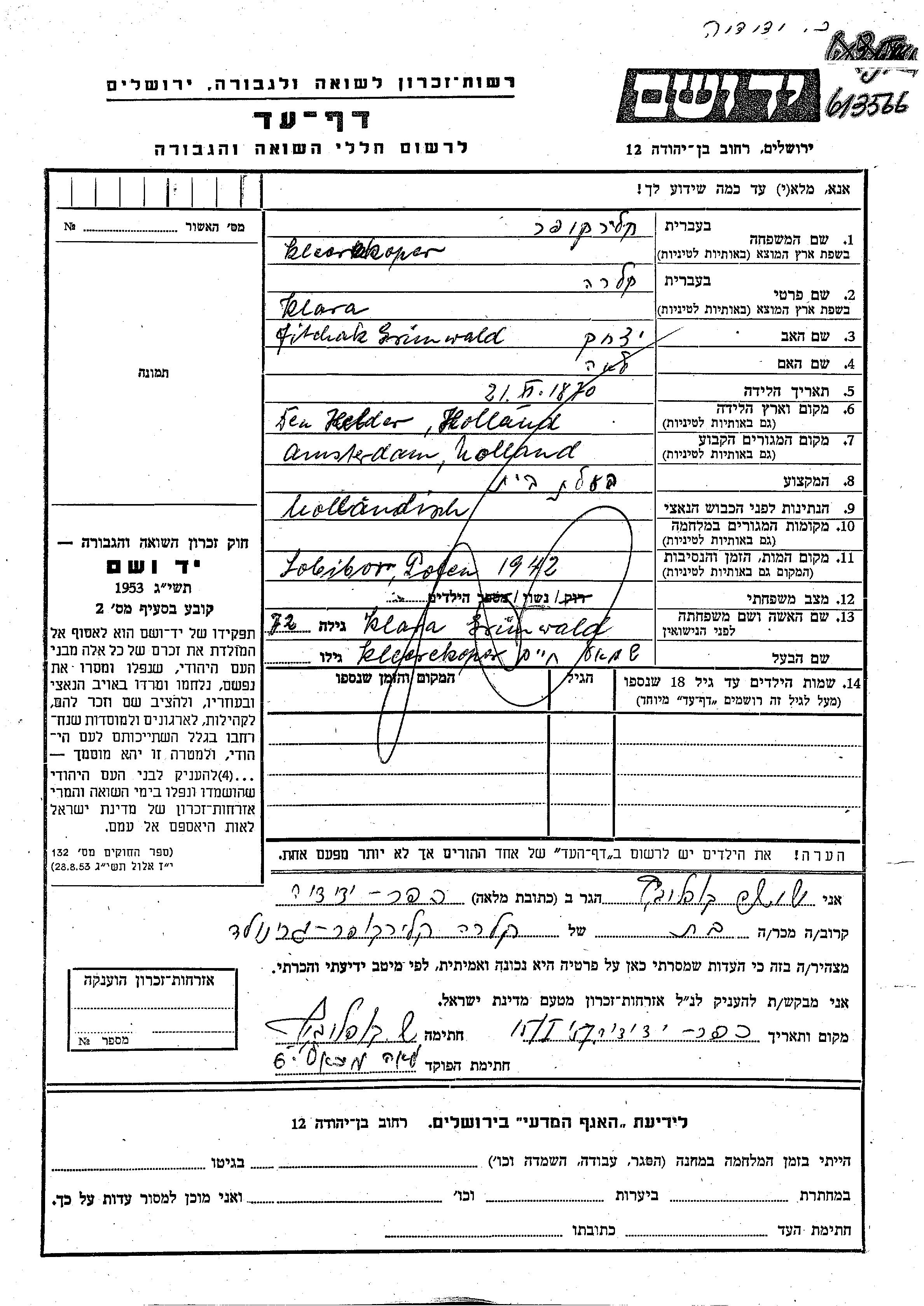 Kleerekoper Klara 1871 Amsterdam, The Netherlands Page of Testimony