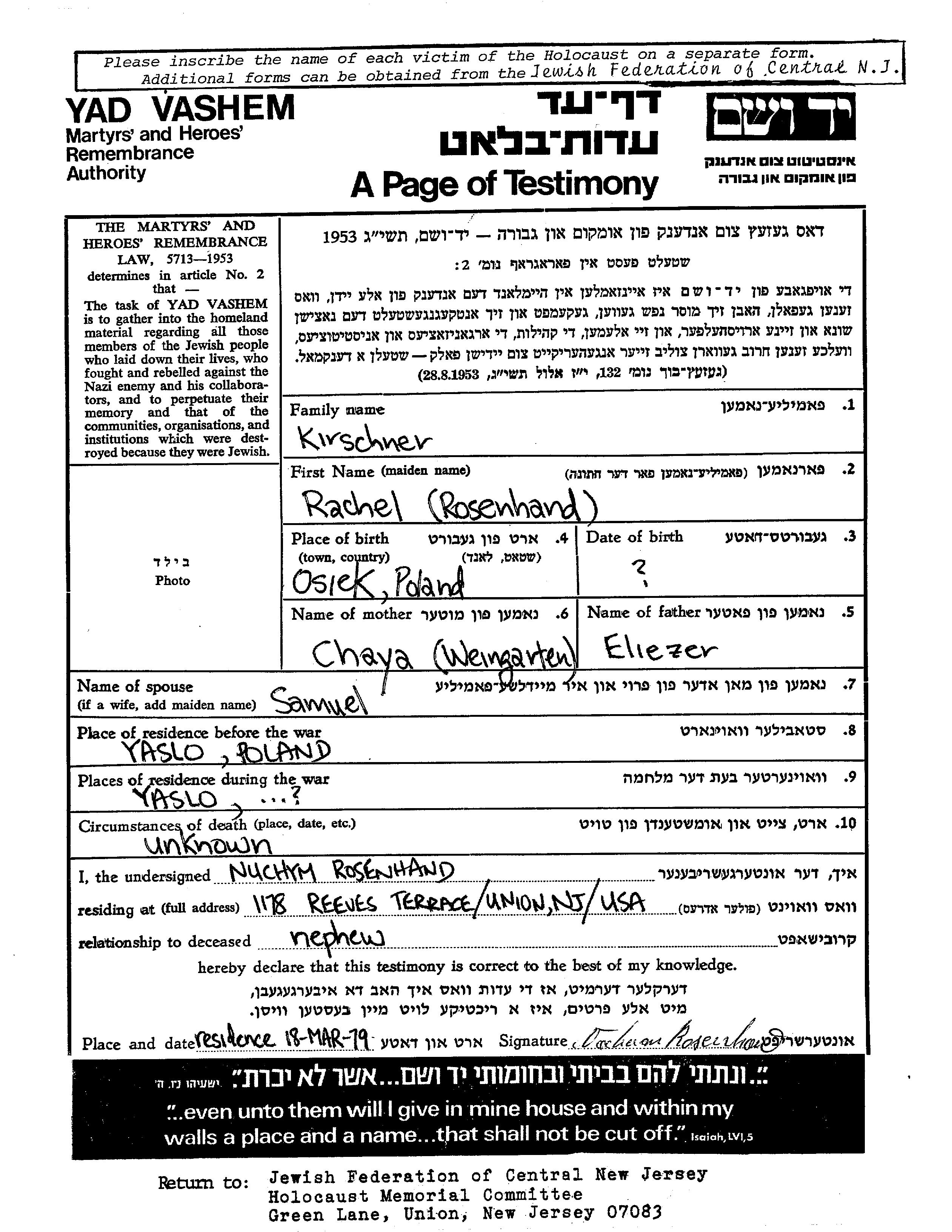 Rachel Kirschner nee Rosenhand was born in Osiek, Poland to Eliezer and Chaya. She was married to Samuel. Prior to WWII she lived in Yaslo, Poland. During the war she was in Yaslo, Poland. Rachel was murdered in the Shoah.