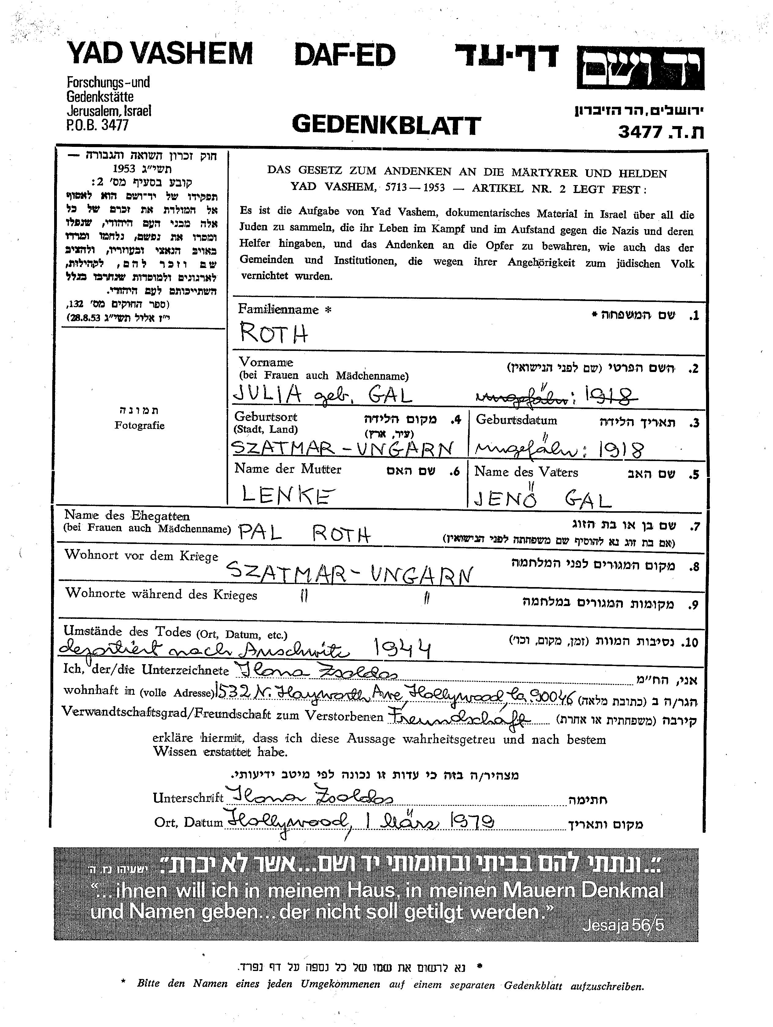 Roth Julia 1918 Szatmarnemeti, Romania Page of Testimony