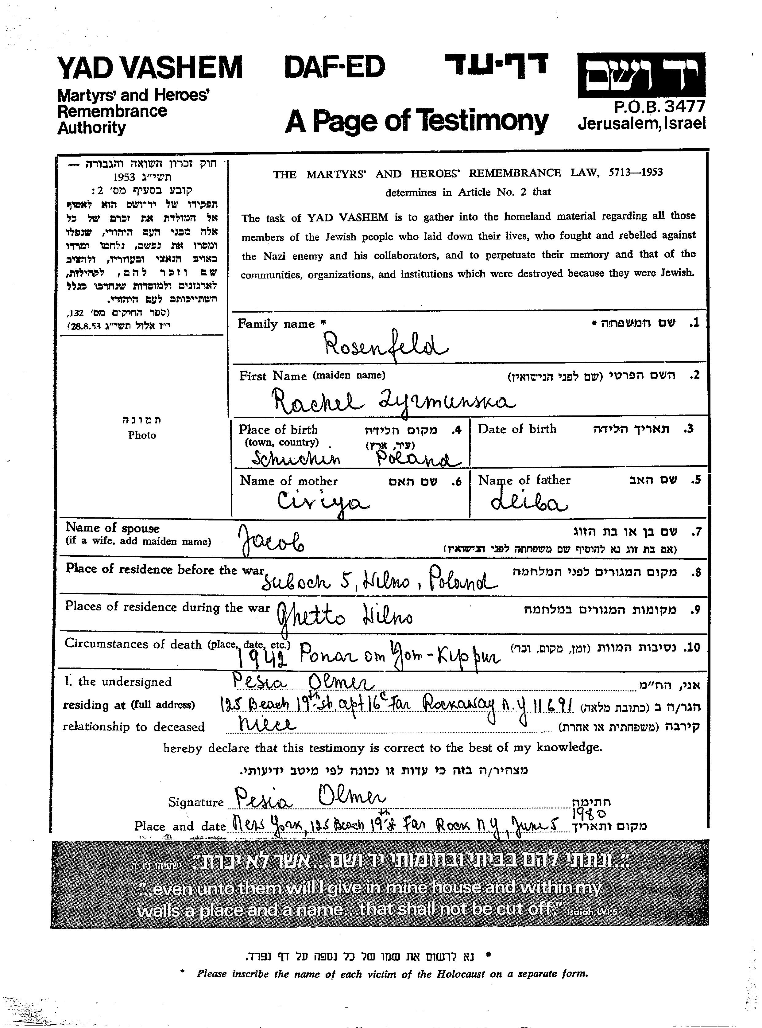Rachel Rosenfeld nee Zyrminski was born in Szczucin, Poland to Leiba and Ciriya. She was married to Jacob. Prior to WWII she lived in Wilno, Poland. During the war she was in Wilno, Poland. Rachel was murdered in the Shoah. Place of death: Ponary Area, Poland, 1942.