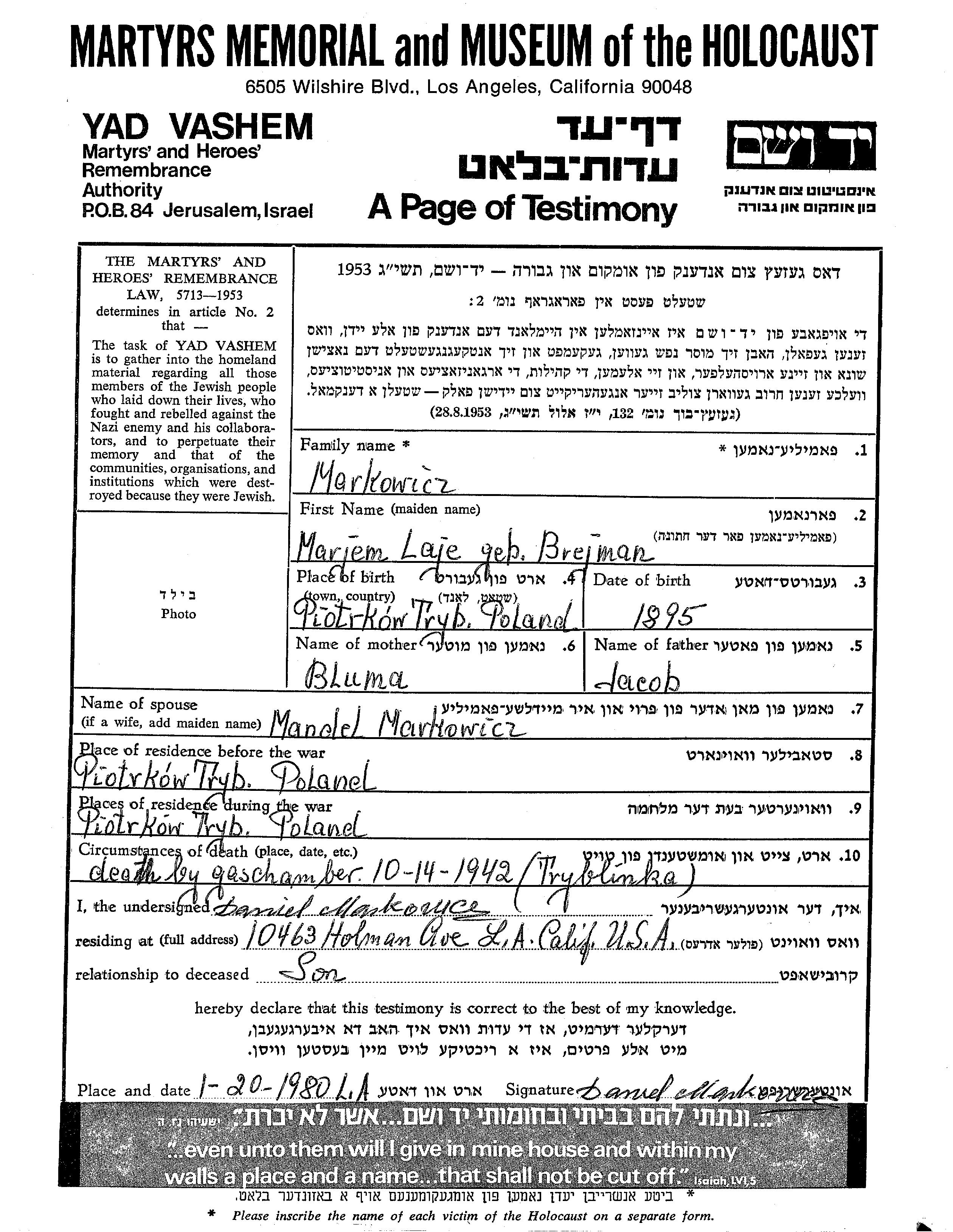 Markowicz Marjem 1895 Pioterkow, Poland Page of Testimony