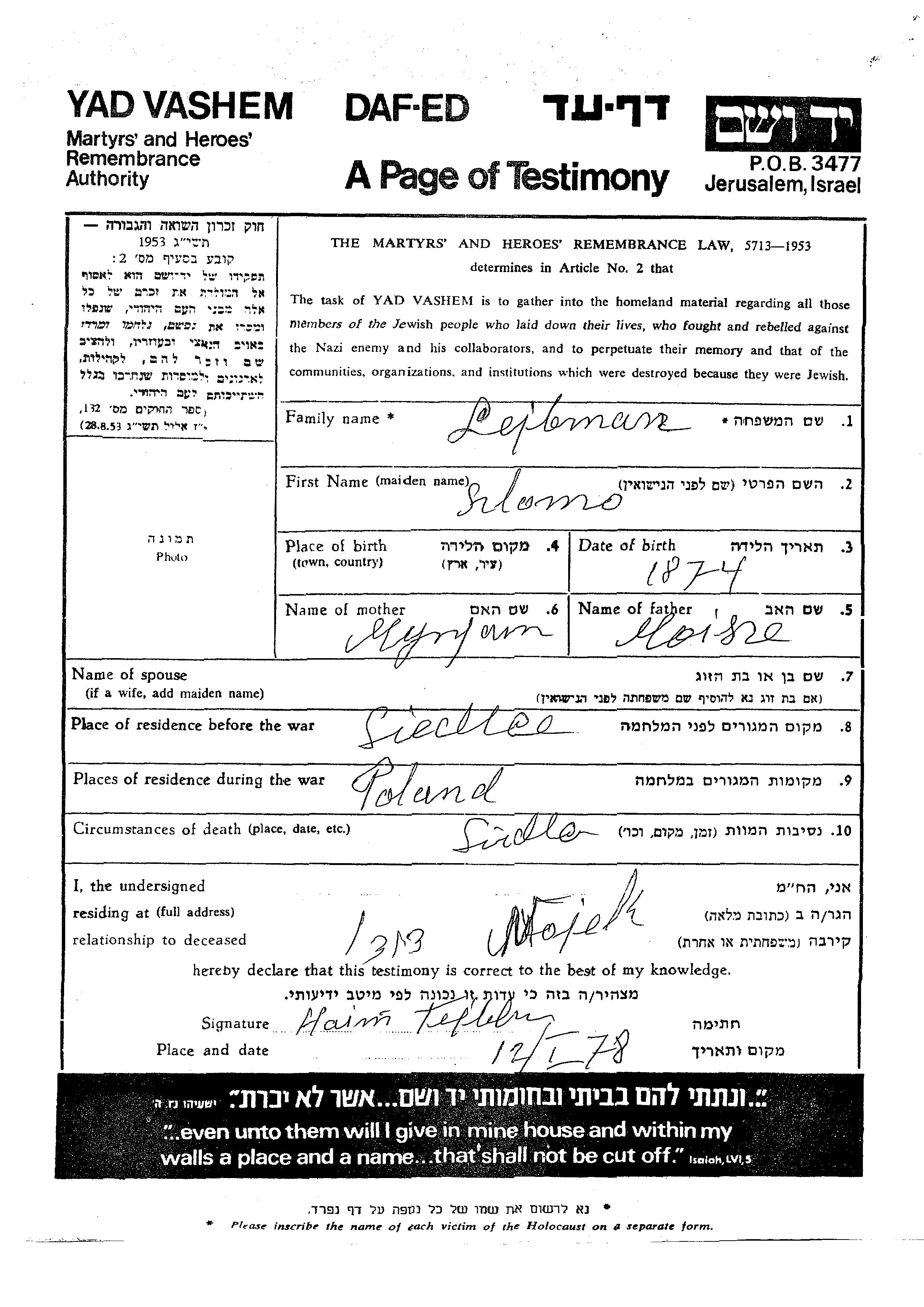 Lejbman Szlomo 1874 Siedlce, Poland Page of Testimony