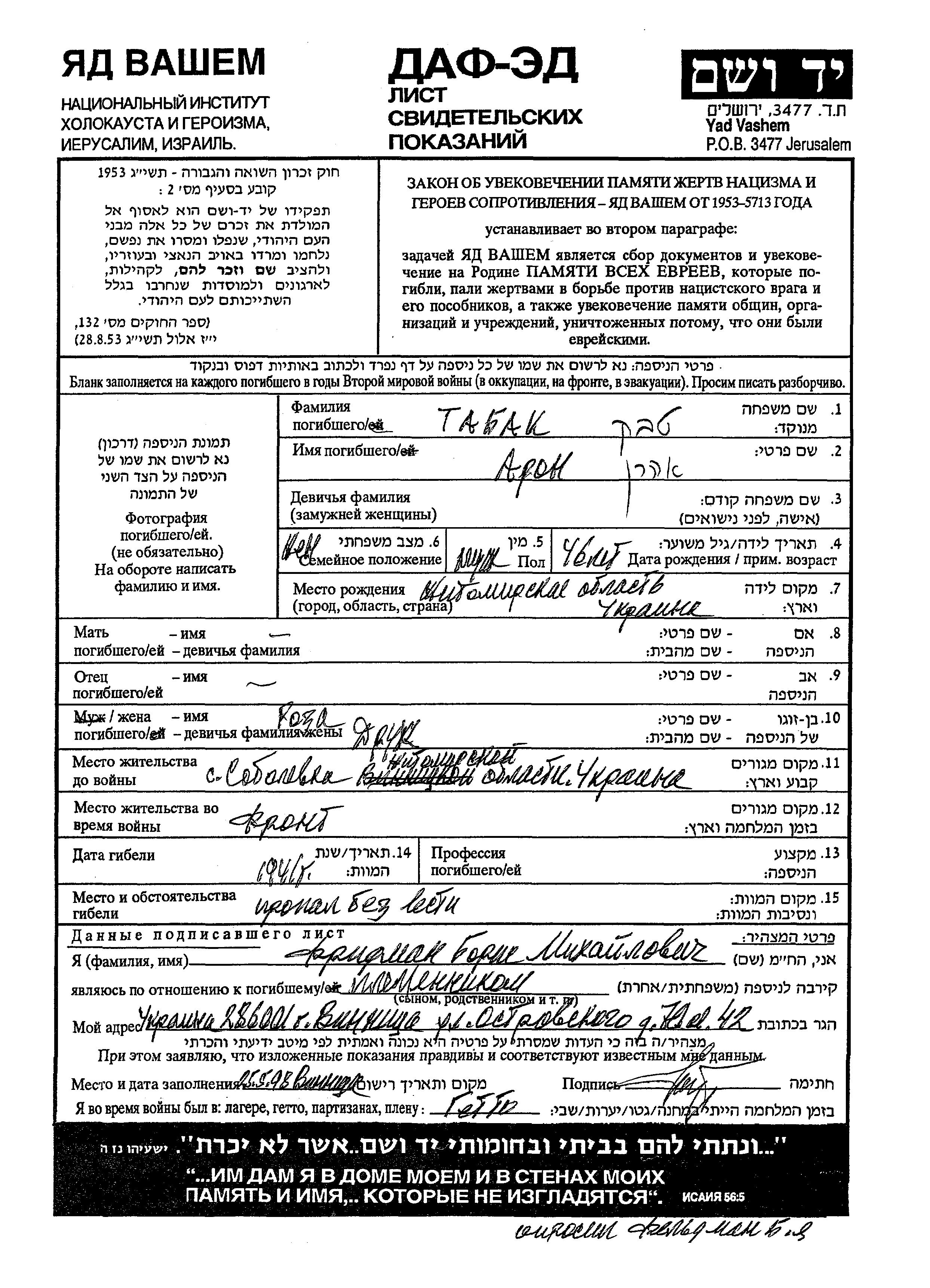 Aron Tabak was born in Zhitomir, Ukraine (USSR). He was married to Roza. Prior to WWII he lived in Sobolevka, Ukraine (USSR). During the war he was in the Soviet armed forces. Aron was killed in military service in WWII. Place of death: the Soviet armed forces, 1941.