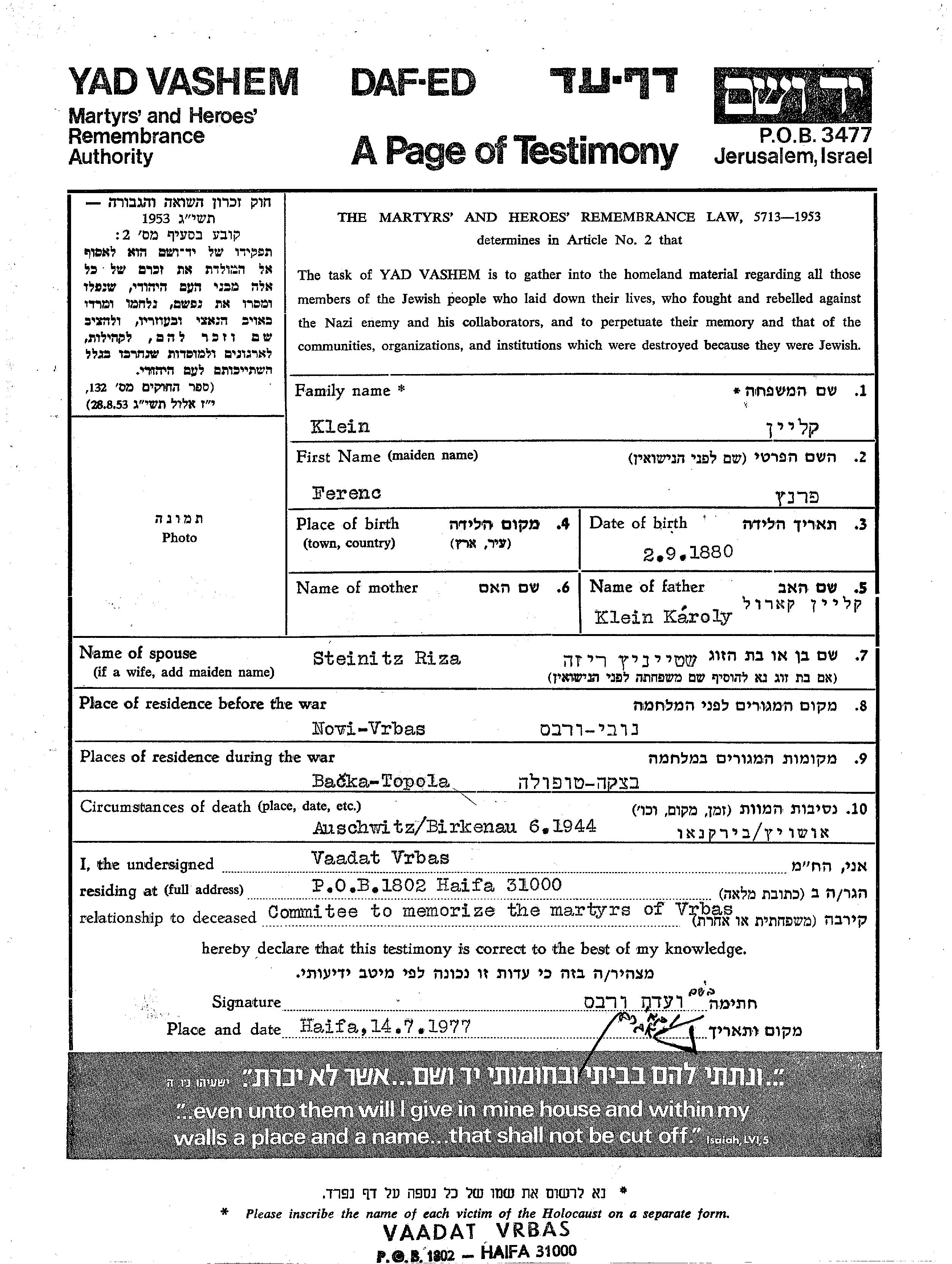 Klein Ferentz 1880 Novi Vrbas, Yugoslavia Page of Testimony