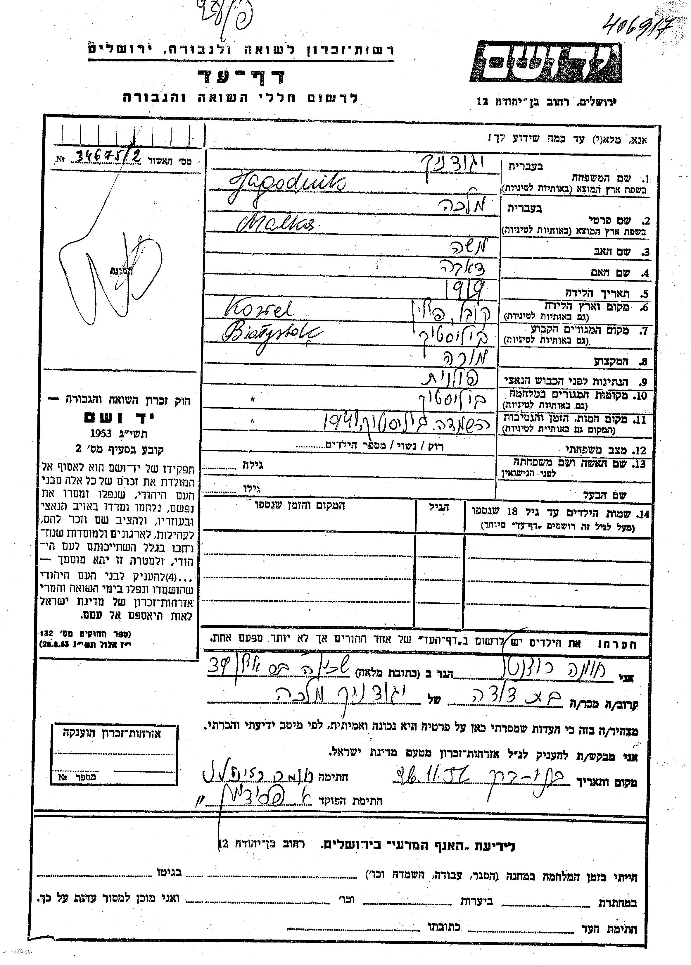 Jagodnik Malka 1919 Bialystok, Poland Page of Testimony