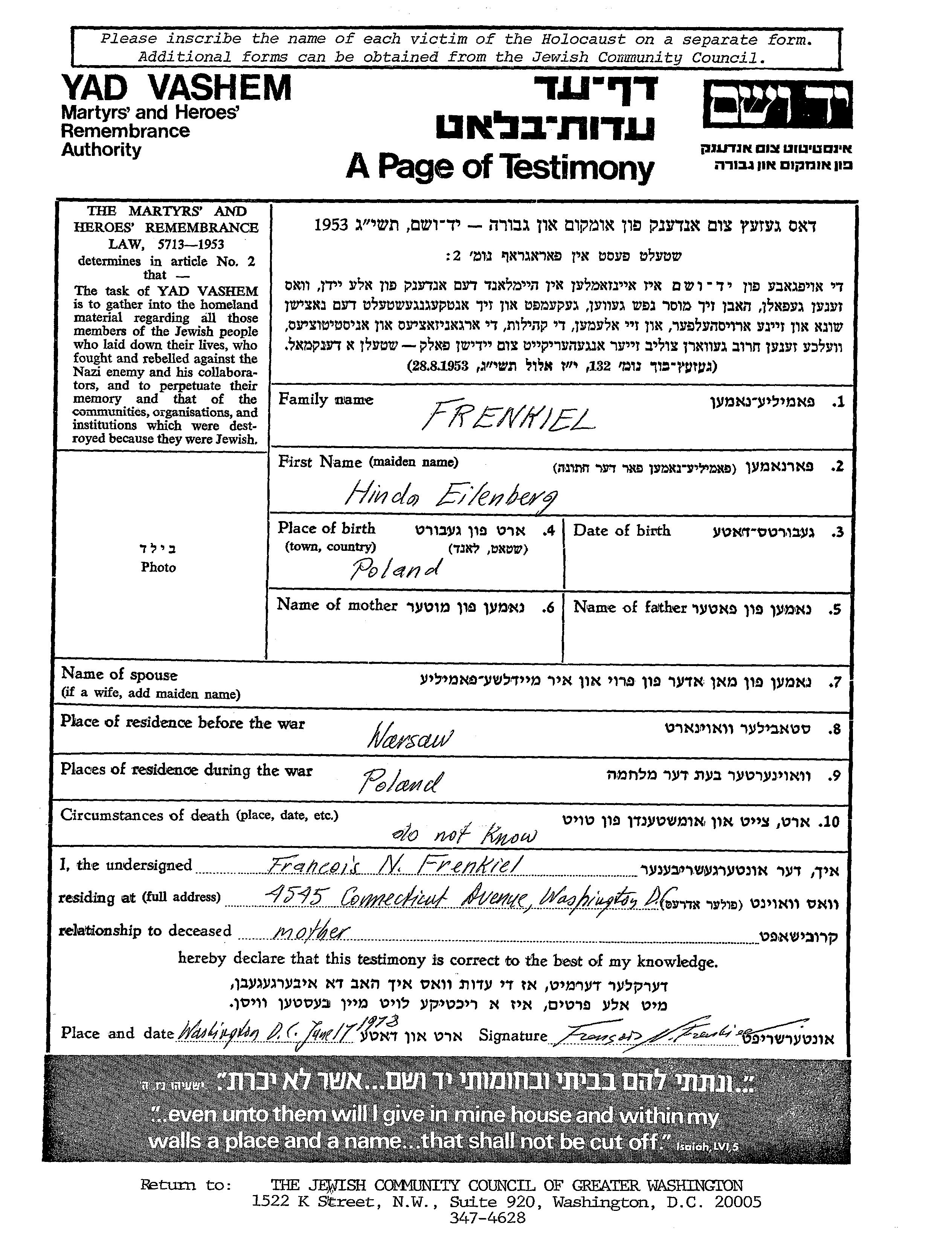 Hinda Frenkiel nee Eulenberg was born in Poland. During the war she was in Poland.