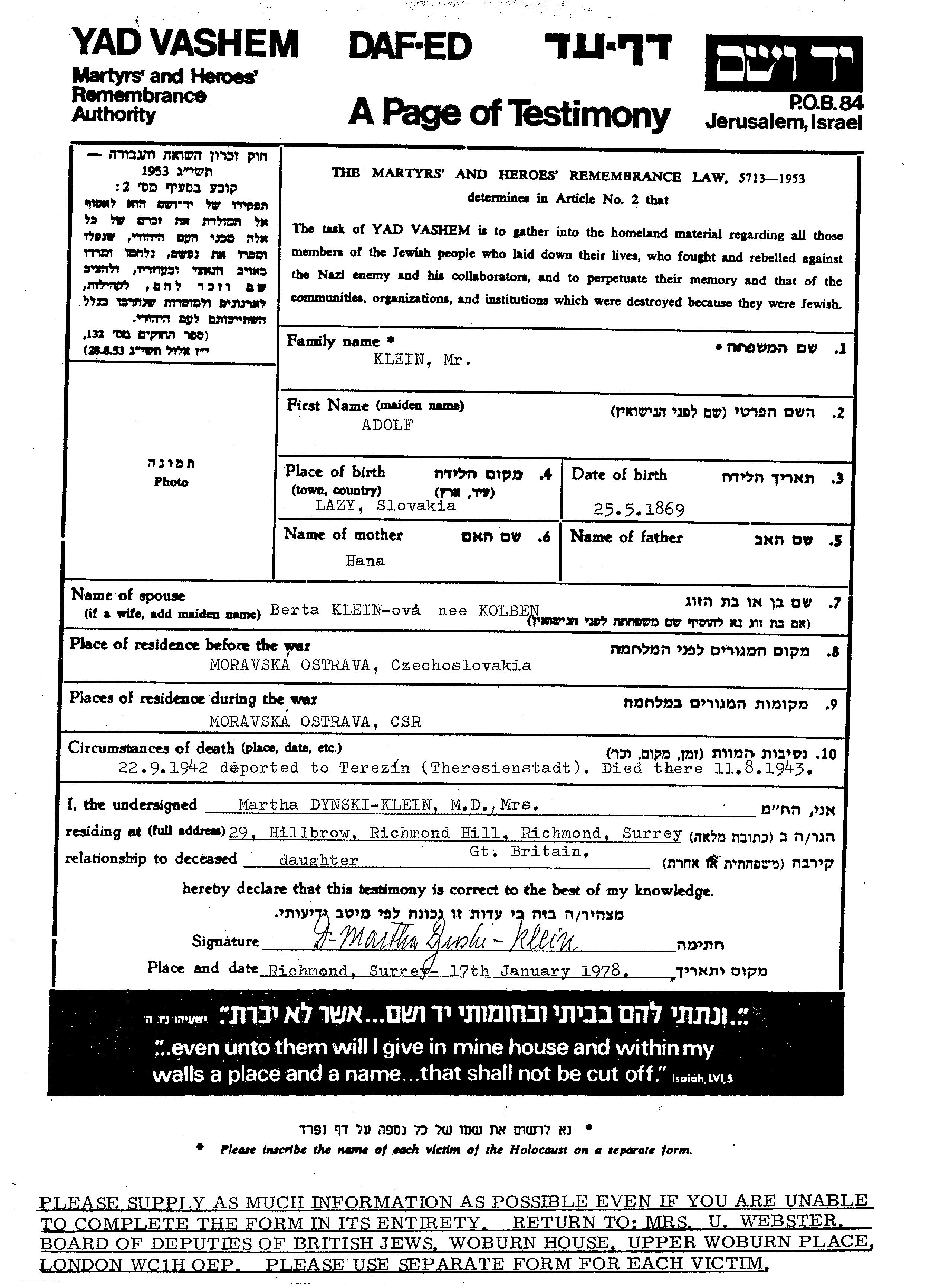 Adolf Klein was born in Lazy, Czechoslovakia, 1869 to Hana. He was married to Berta nee Kolben. Prior to WWII he lived in Moravska Ostrava, Czechoslovakia. During the war he was in Moravska Ostrava, Czechoslovakia.