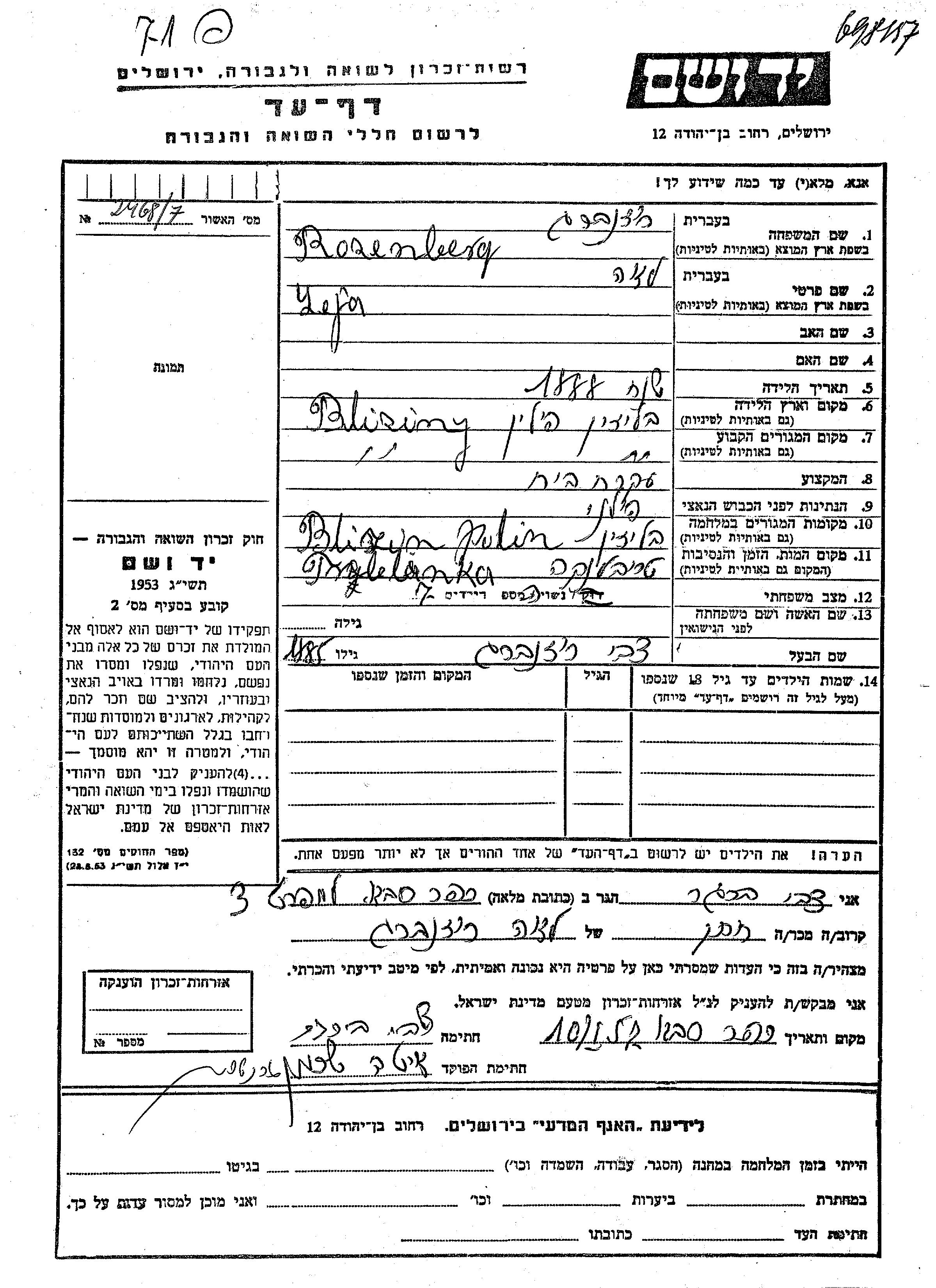 Leya Rozenberg was born in Blizin, Poland, 1888. She was a housewife and married to Tzvi. Prior to WWII she lived in Blizhin, Poland. During the war she was in Blizhin, Poland. Leya was murdered in the Shoah. Place of death: Treblinka, Poland.
