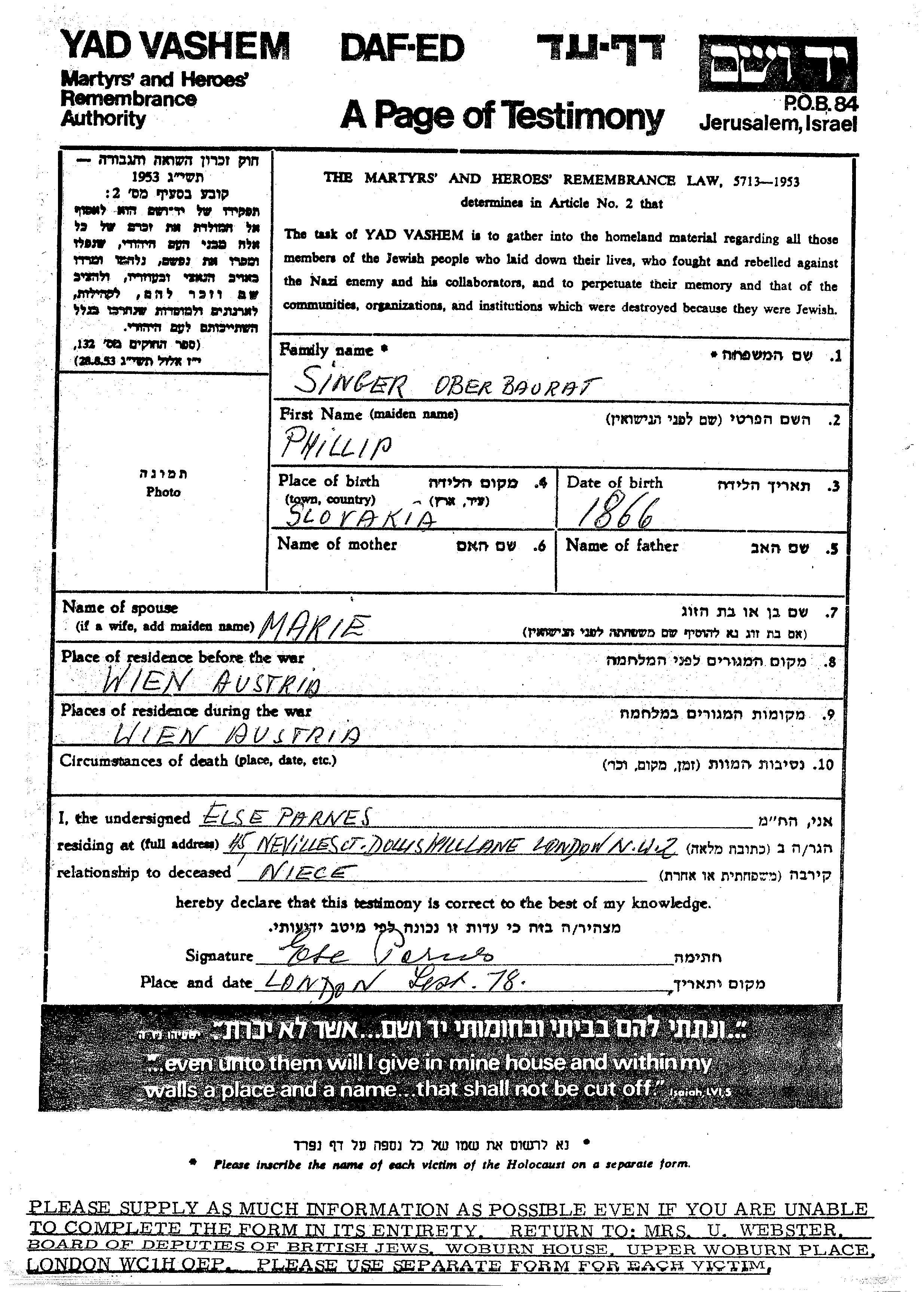 Singer Phillip 1866 Wien, Austria Page of Testimony