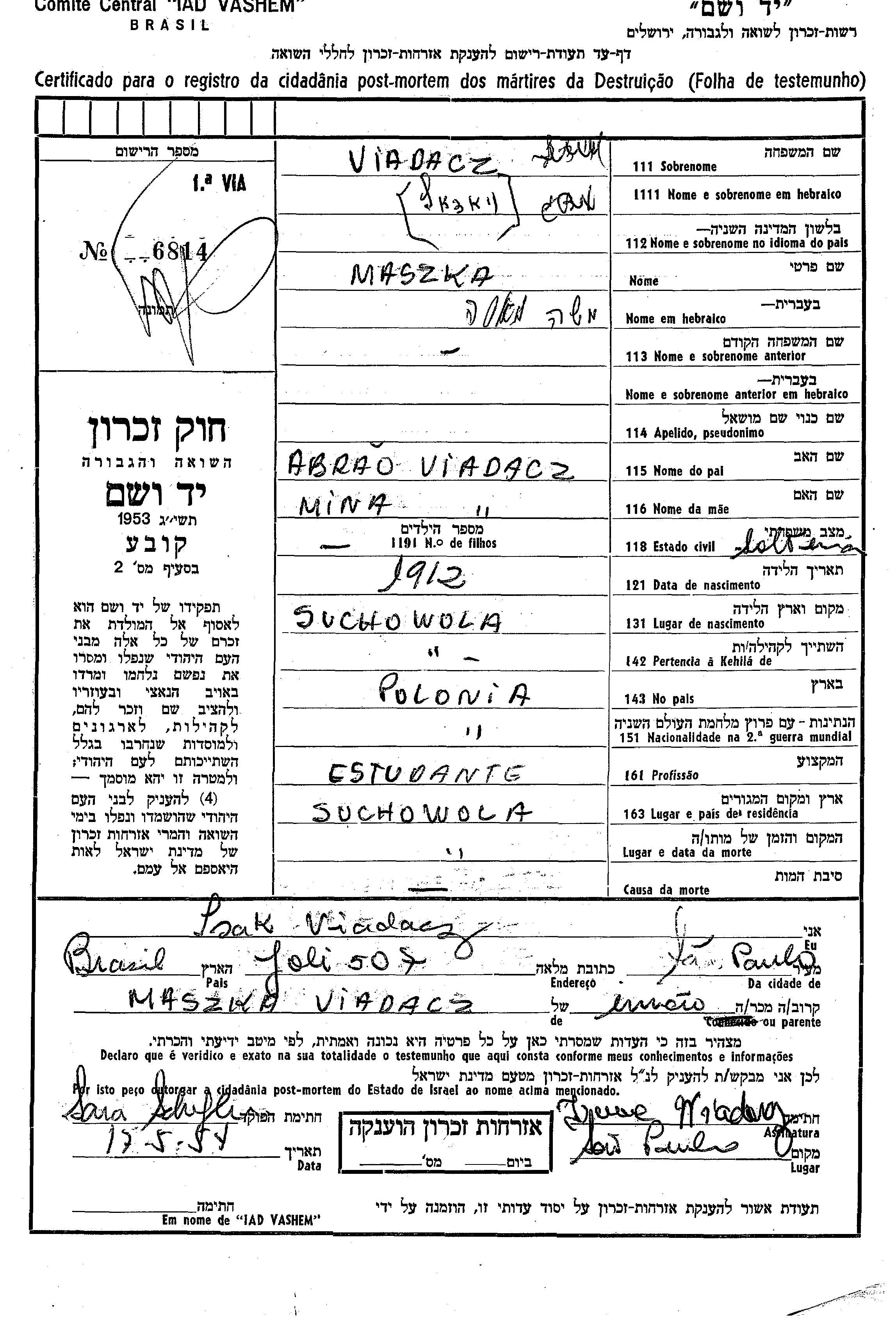 Maszka Moshe Viadacz was born in Suchowola, Poland, 1912 to Abrao and Mina. She was a pupil and single. Prior to WWII she lived in Suchowola, Poland. Maszka Moshe was murdered in the Shoah.