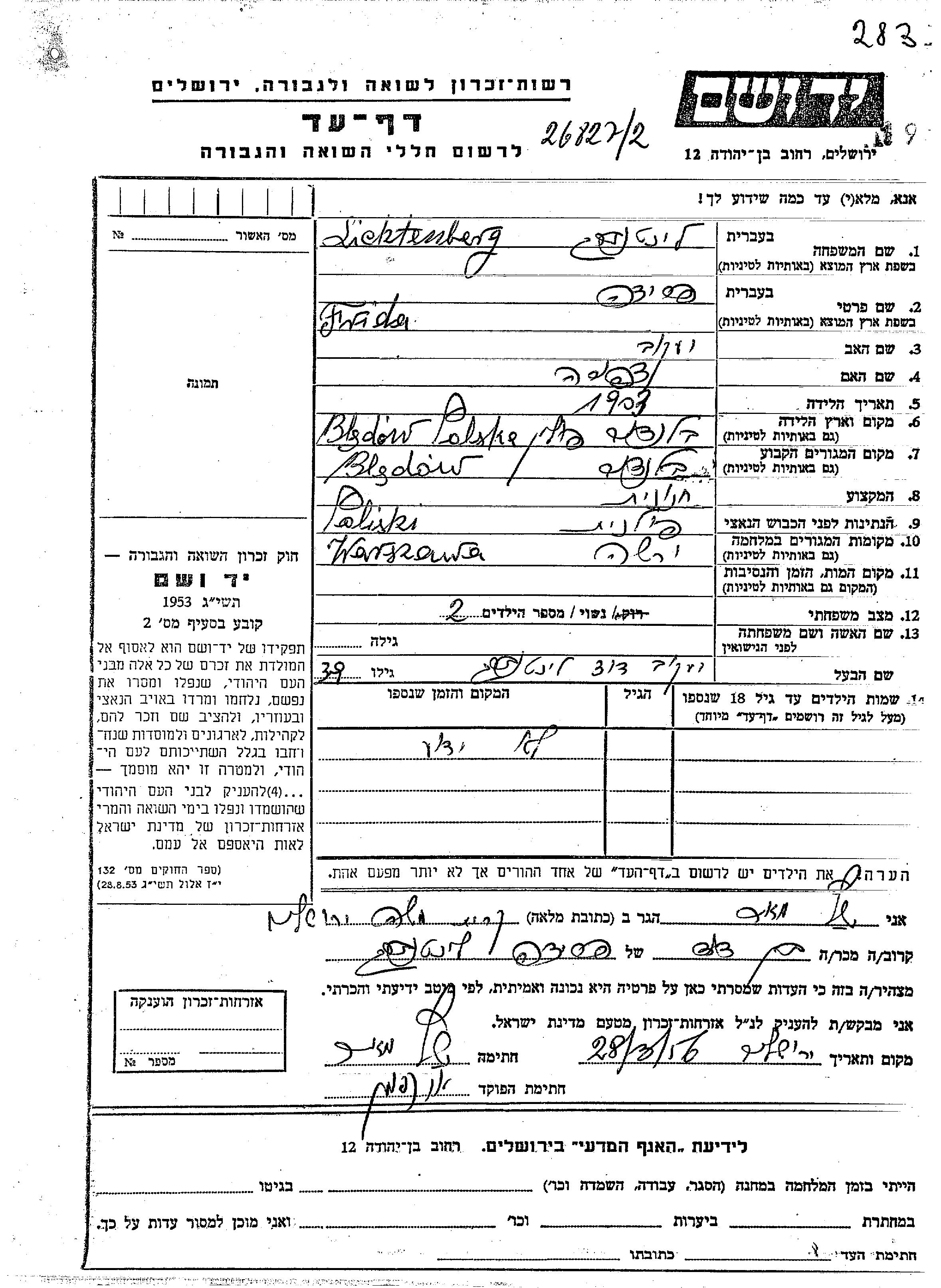 Lichtenberg Frida 1903 Bledow, Poland Page of Testimony