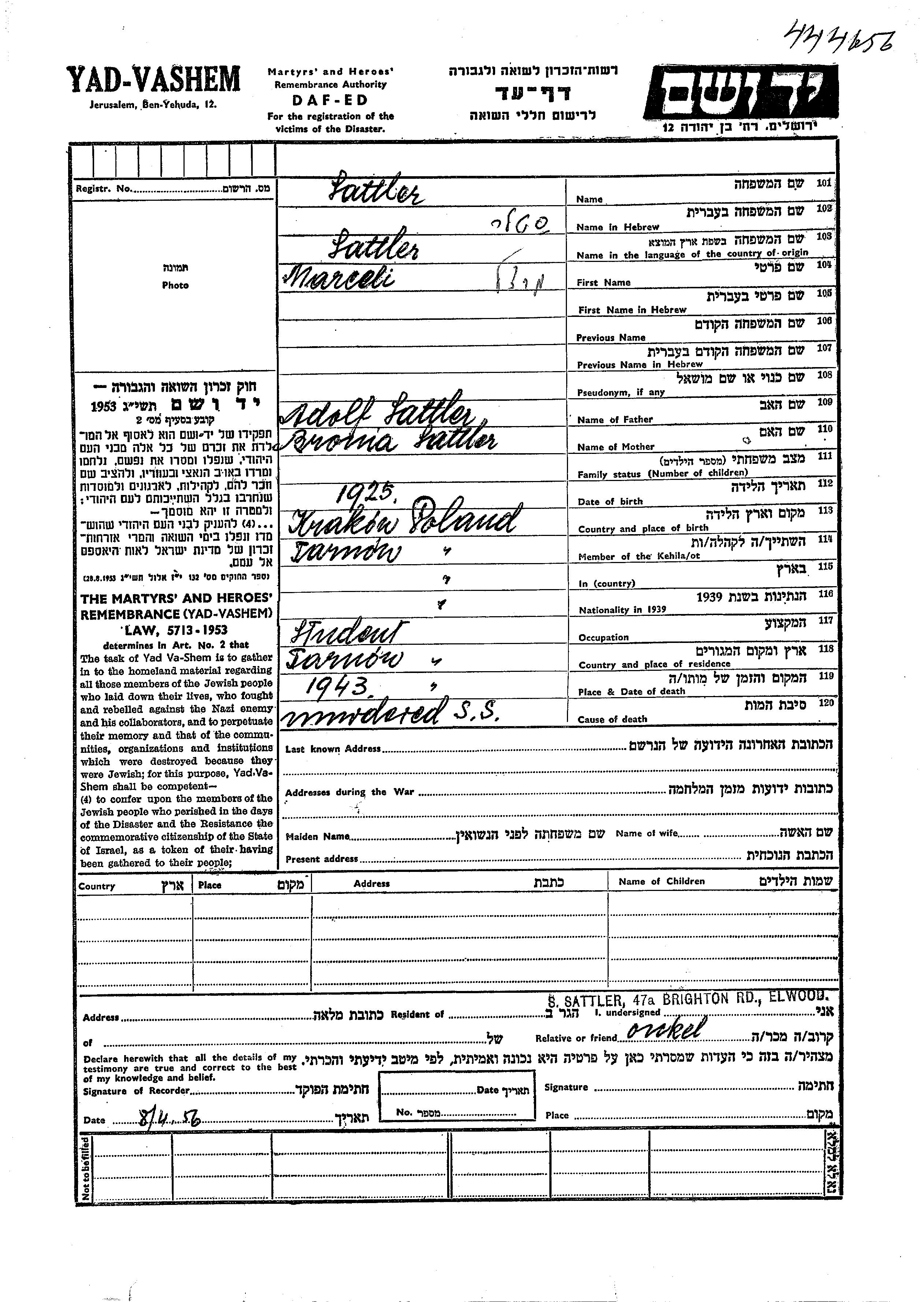 Sattler Marceli 1925 Tarnow, Poland Page of Testimony