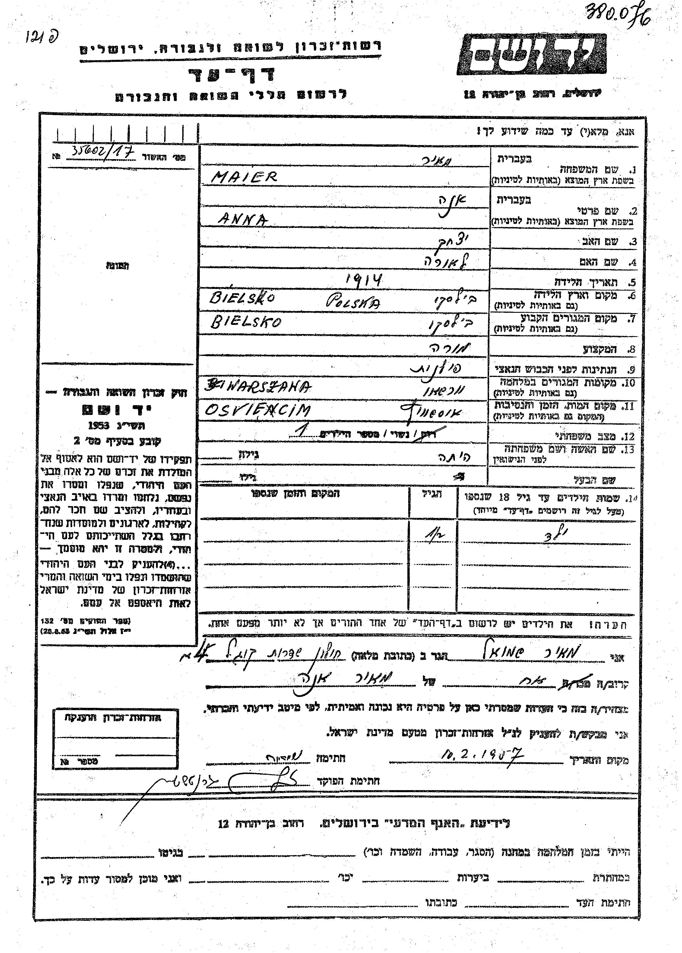 Anna Maier was born in Bielsko, Poland, 1914 to Yitzkhak and Laura. She was a teacher and married. Prior to WWII she lived in Bielsko, Poland. During the war she was in Warsaw, Poland. Anna was murdered in the Shoah. Place of death: Auschwitz, Poland.