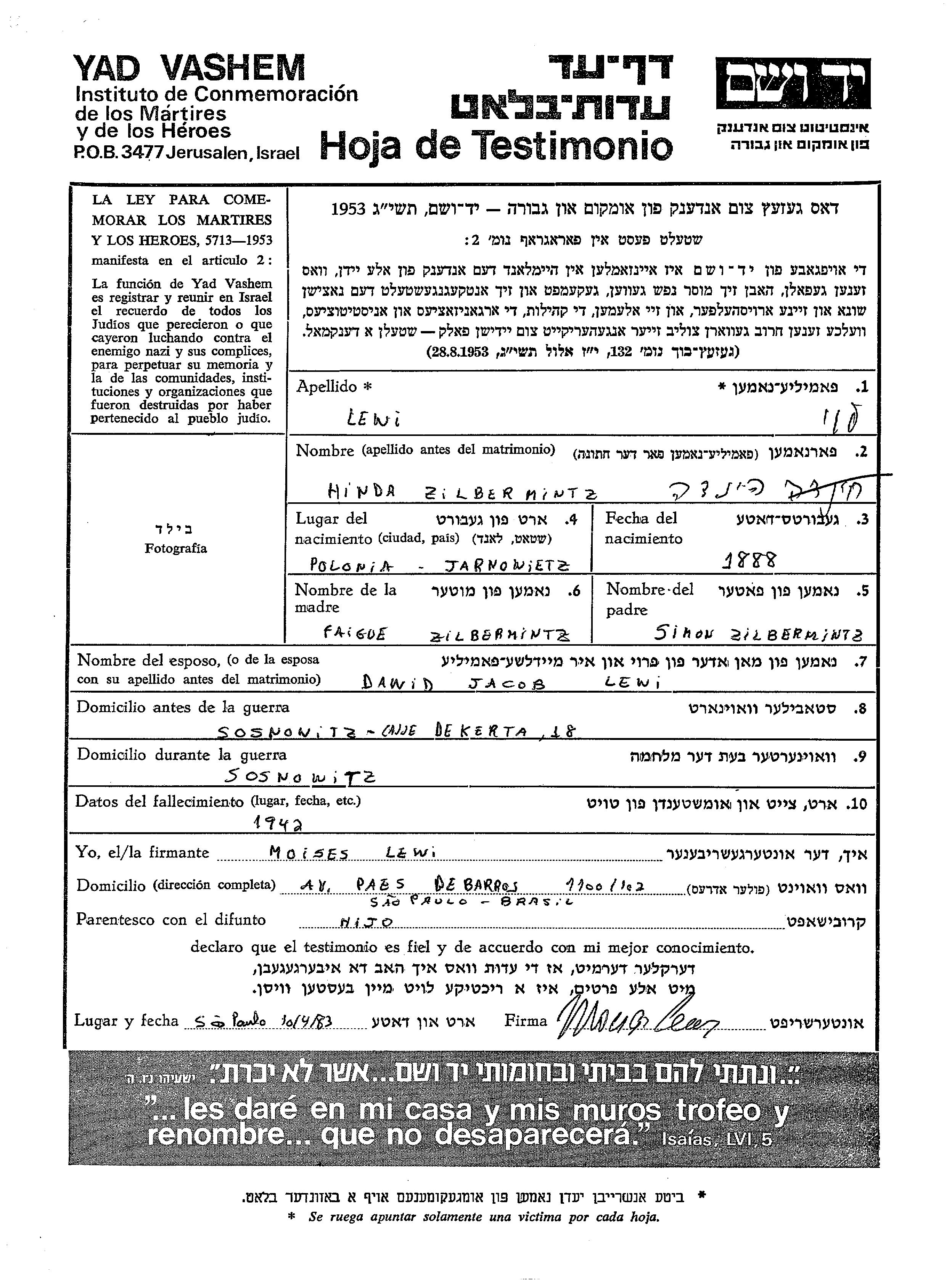 Hinda Levi nee Zilbermintz was born in Jarnowiec, Poland, 1888 to Simon and Faigue. She was married to Dawid Jacob. Prior to WWII she lived in Sosnowic, Poland. During the war she was in Sosnowic, Poland. Hinda was murdered in the Shoah. Place of death: unknown, 1942.