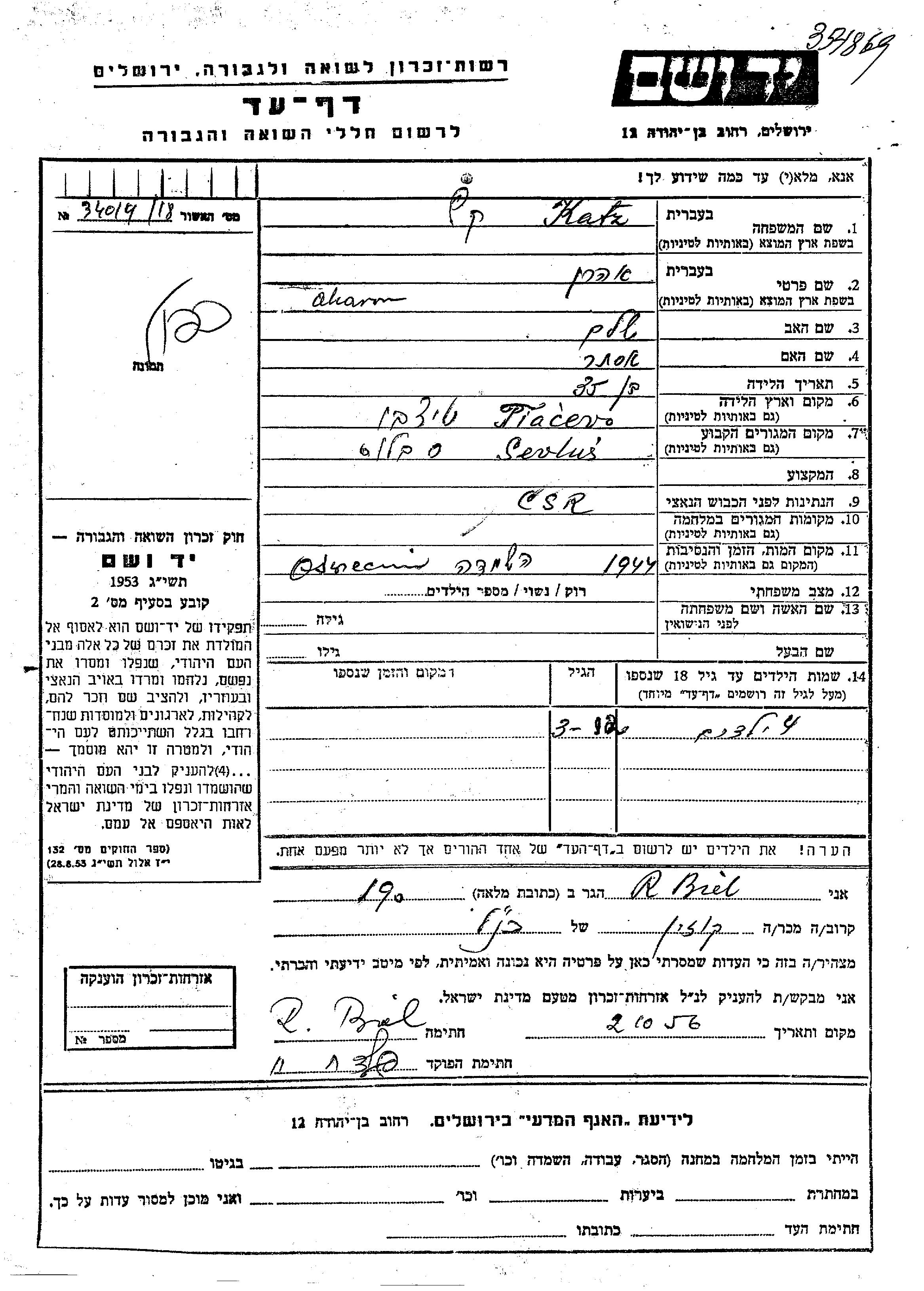 Katz Aharon Sevlus, Czechoslovakia Page of Testimony