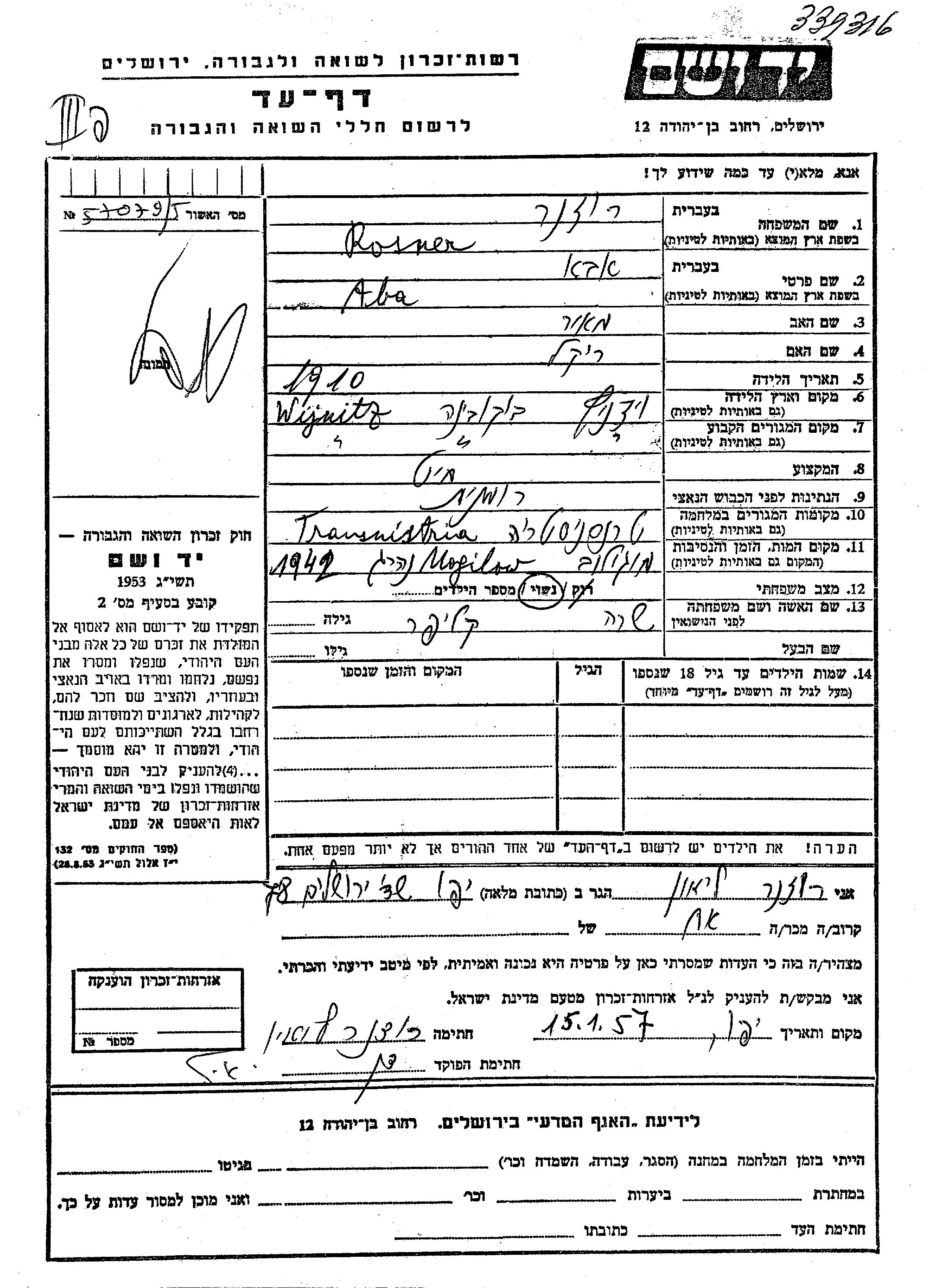 Rosner Aba 1910 Wiznica, Romania Page of Testimony