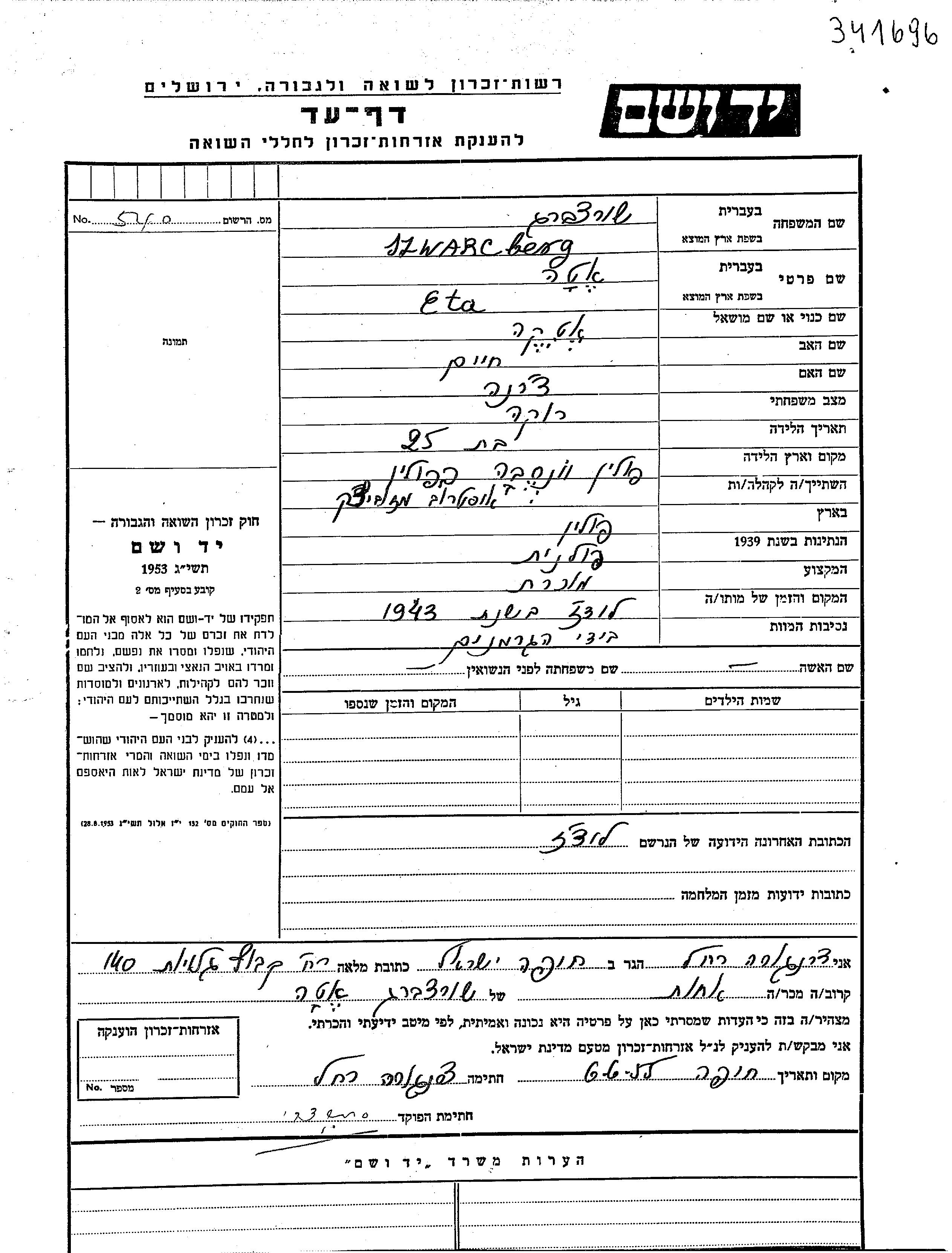 Eta Szwarcberg was born in Wasowo, Poland to Khaim and Charna. She was a saleswoman and single. Prior to WWII she lived in Lodz, Poland. Eta was murdered in the Shoah. Place of death: Lodz, Poland, 1943.
