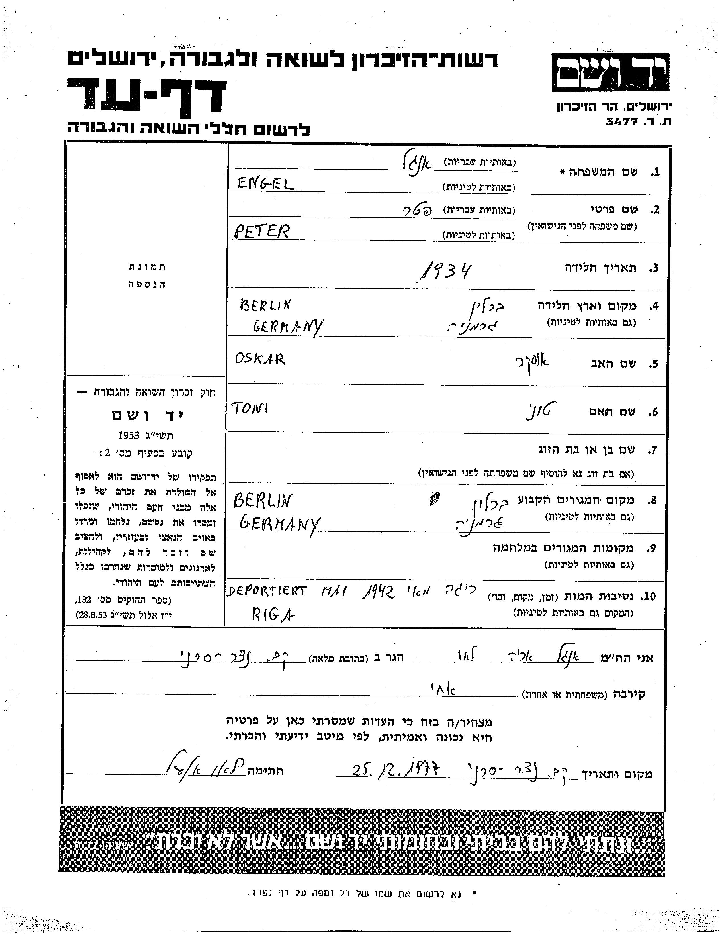 Engel Peter 1934 Berlin, Germany Page of Testimony