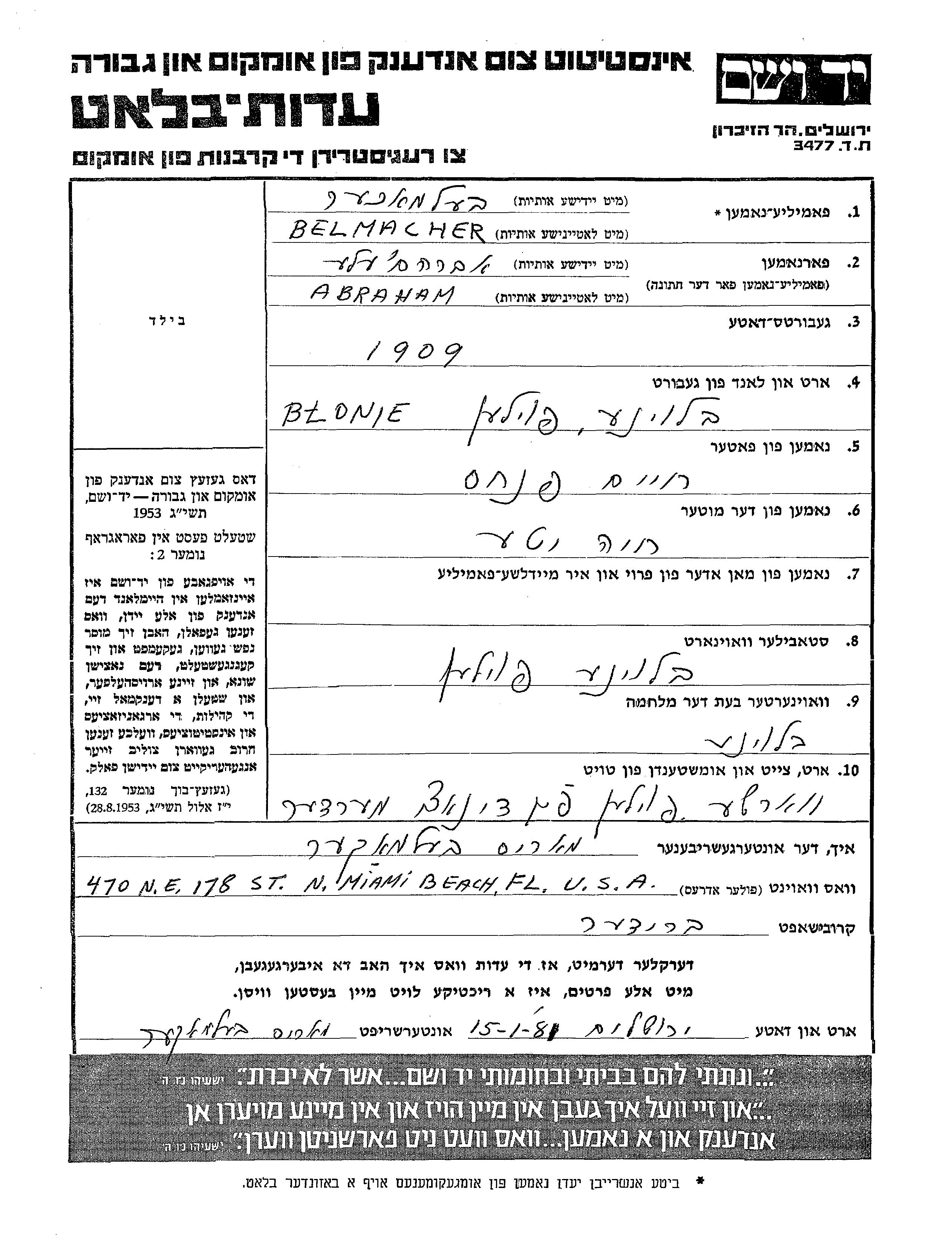 Belmacher Abraham 1909 Blonie, Poland Page of Testimony
