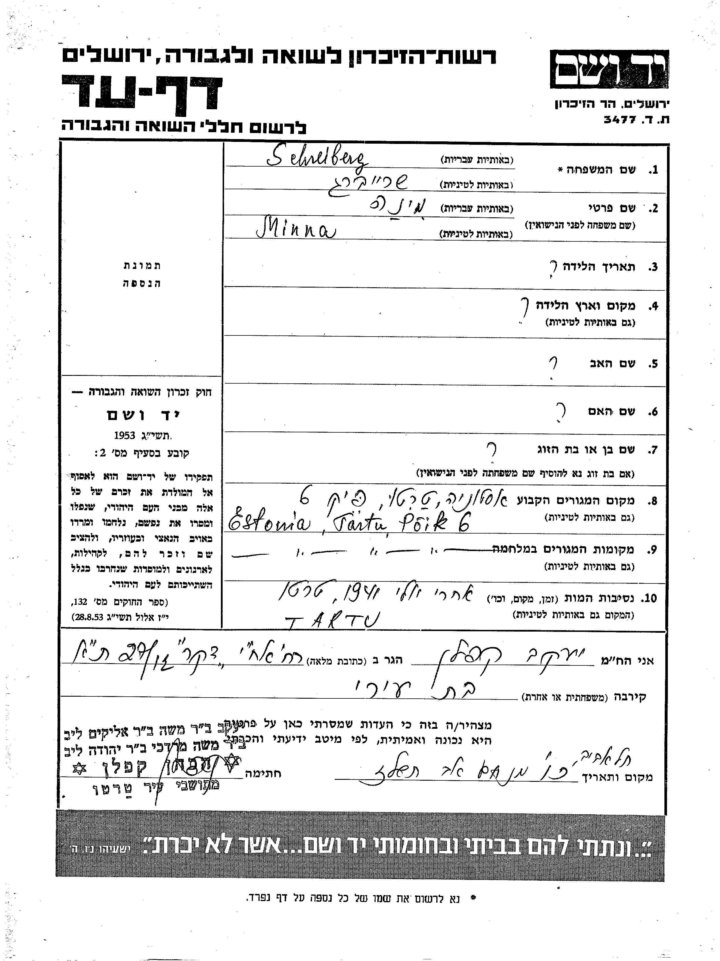 Minna Schreiberg. Prior to WWII she lived in Tartu, Estonia. During the war she was in Tartu, Estonia.