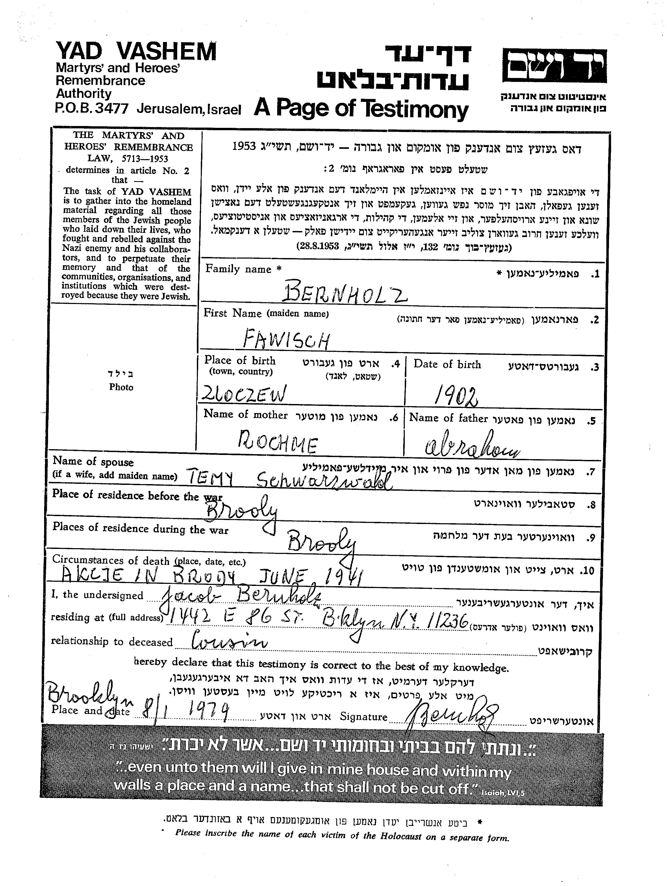 Bernholz Fawisch 1902 Brody, Poland Page of Testimony