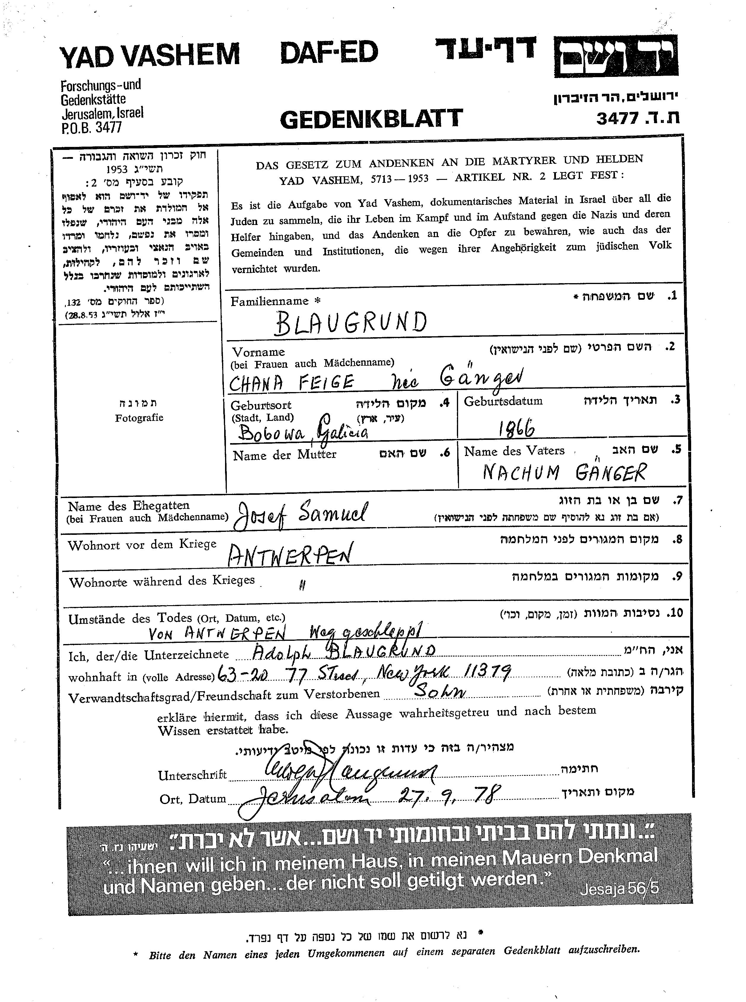 Chana Feiga Blaugrund nee Gaenger was born in Bobowa, Poland, 1866 to Nachum. She was married to Josef Samuel. Prior to WWII she lived in Antwerpen, Belgium. During the war she was in Antwerpen, Belgium.