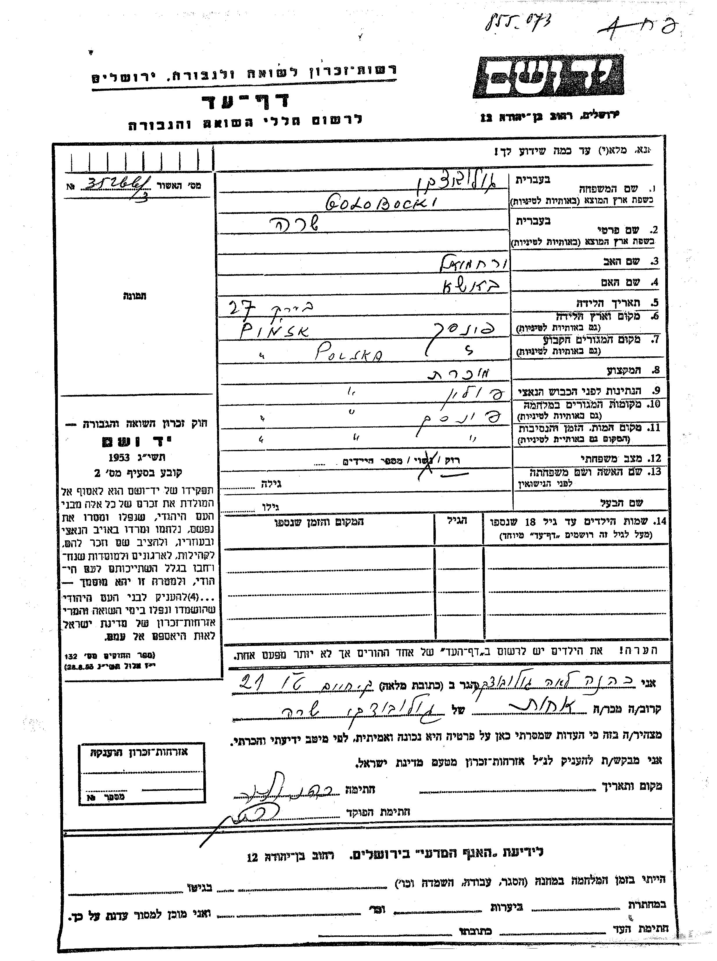 Golobocki Sara Pinsk, Poland Page of Testimony
