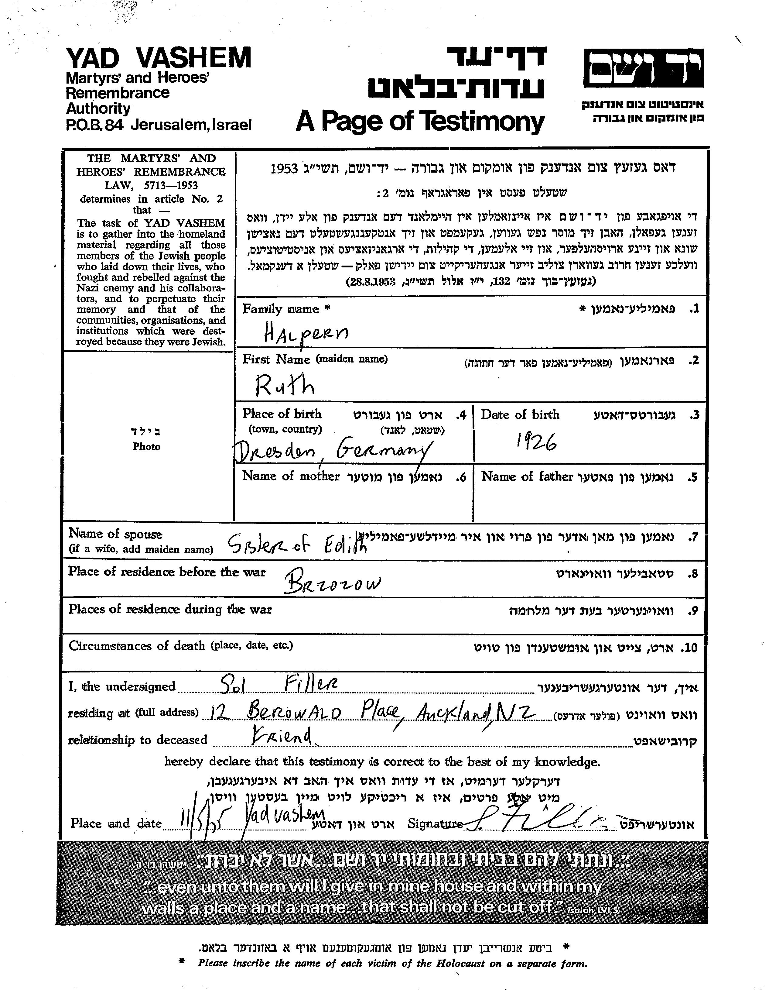 Halpern Ruth 1926 Brzozow, Poland Page of Testimony