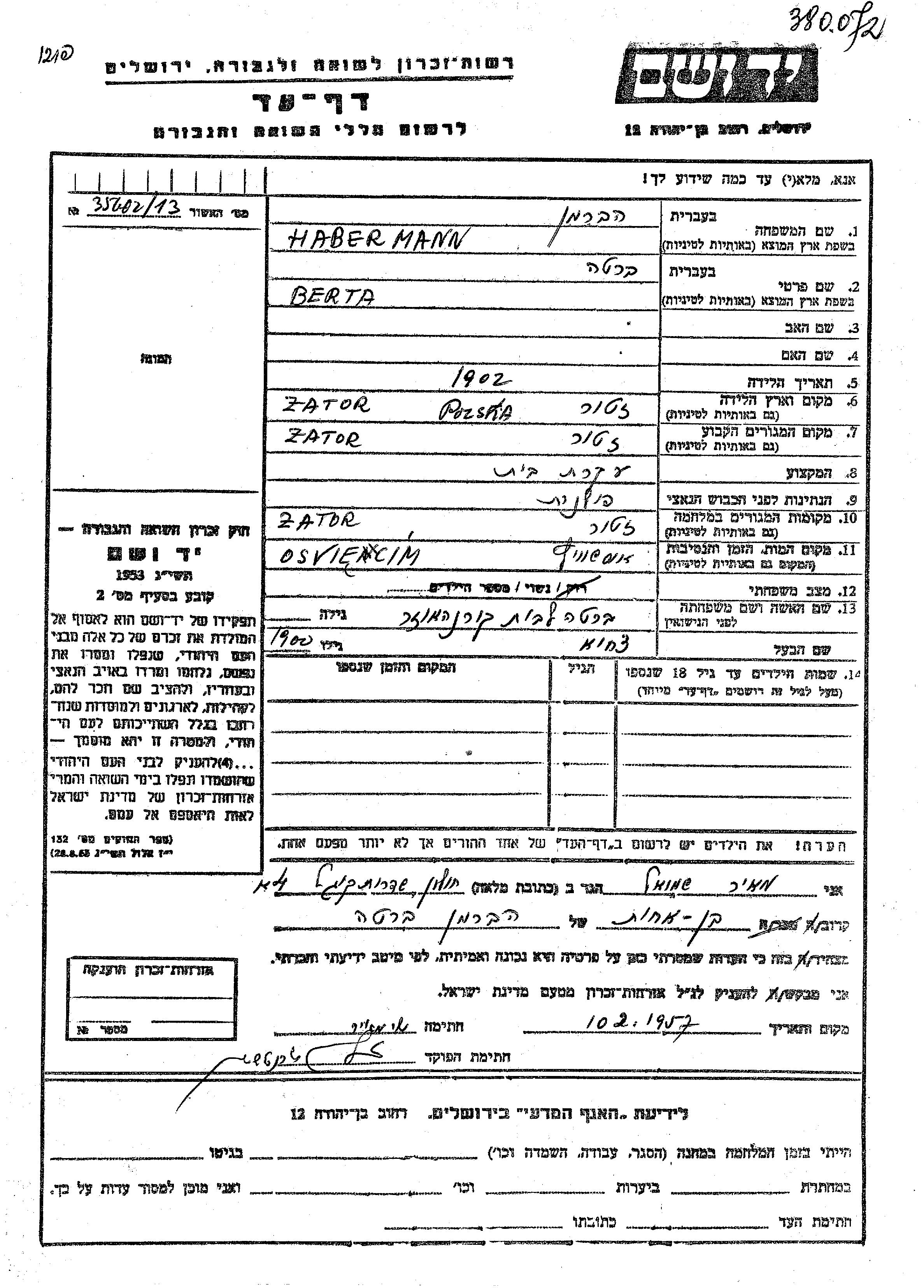 Berta Habermann nee Kornhauzer was born in Zator, Poland, 1902. She was a housewife and married to Tzakhia. Prior to WWII she lived in Zator, Poland. During the war she was in Zator, Poland. Berta was murdered in the Shoah. Place of death: Auschwitz, Poland.