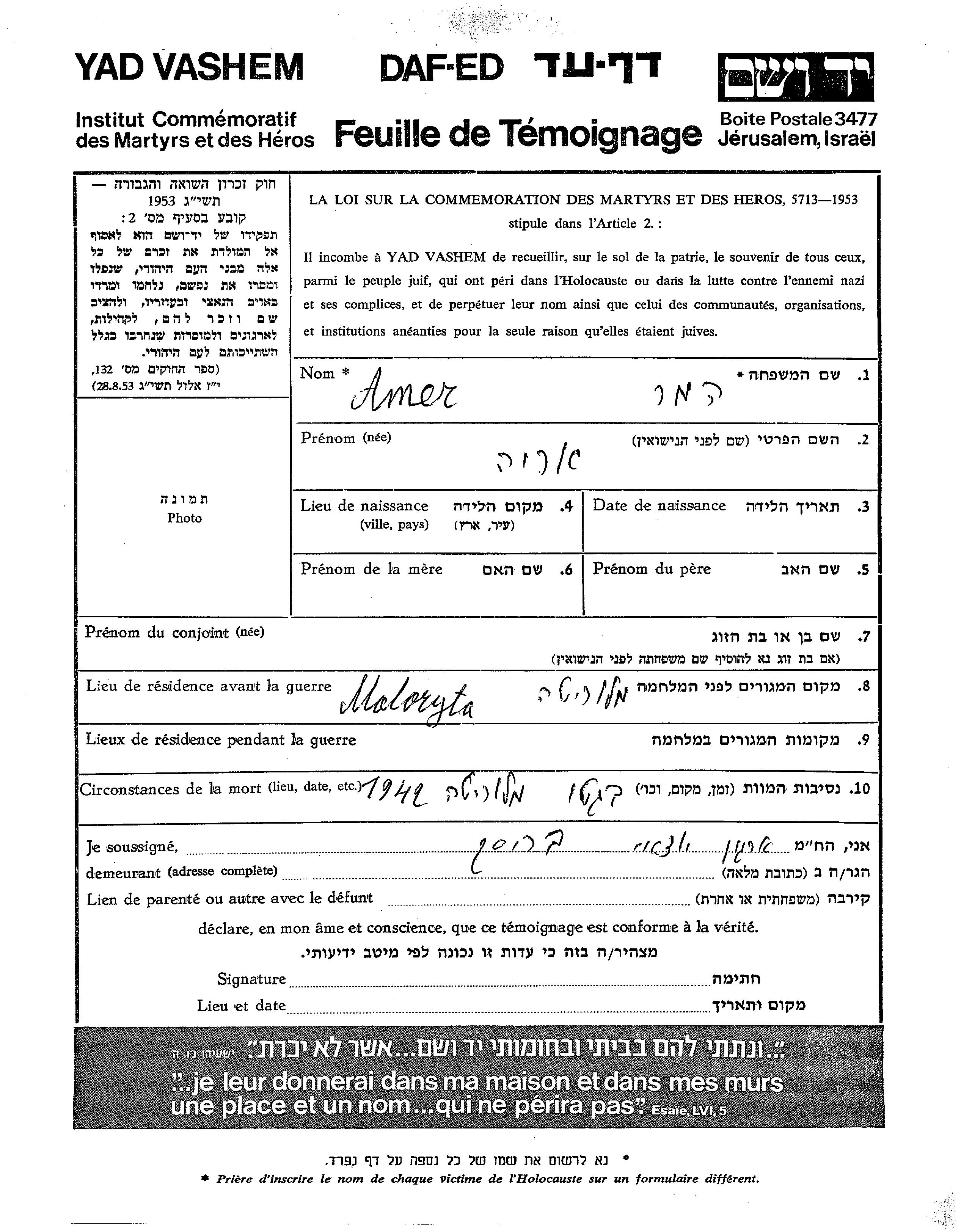 Amar Hamer Arie Maloryta, Poland Page of Testimony