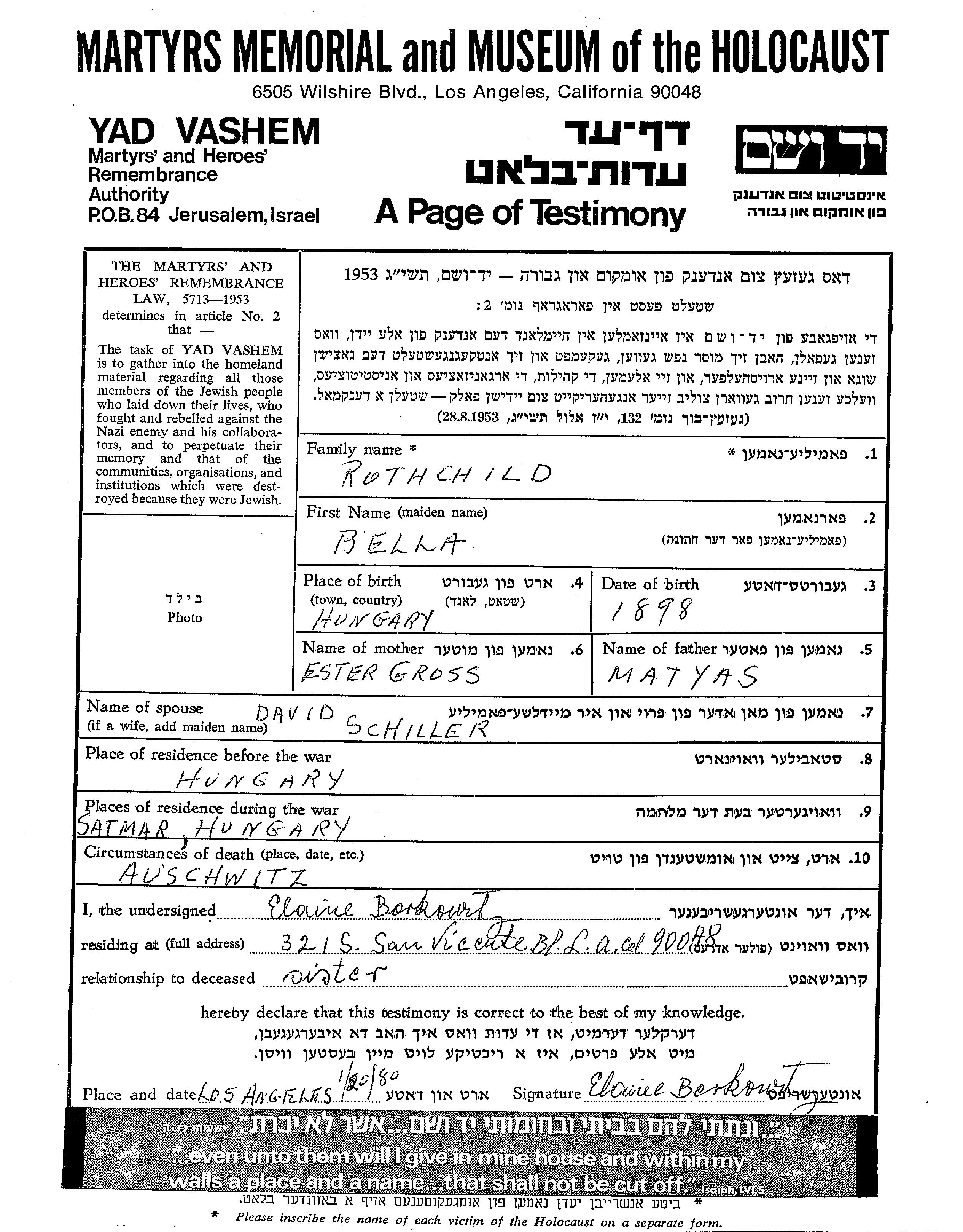 Bella Schiller nee Rothchild was born in Hungary, 1898 to Matyas and Ester. She was married to David. Prior to WWII she lived in Hungary. During the war she was in Satmar, Romania.