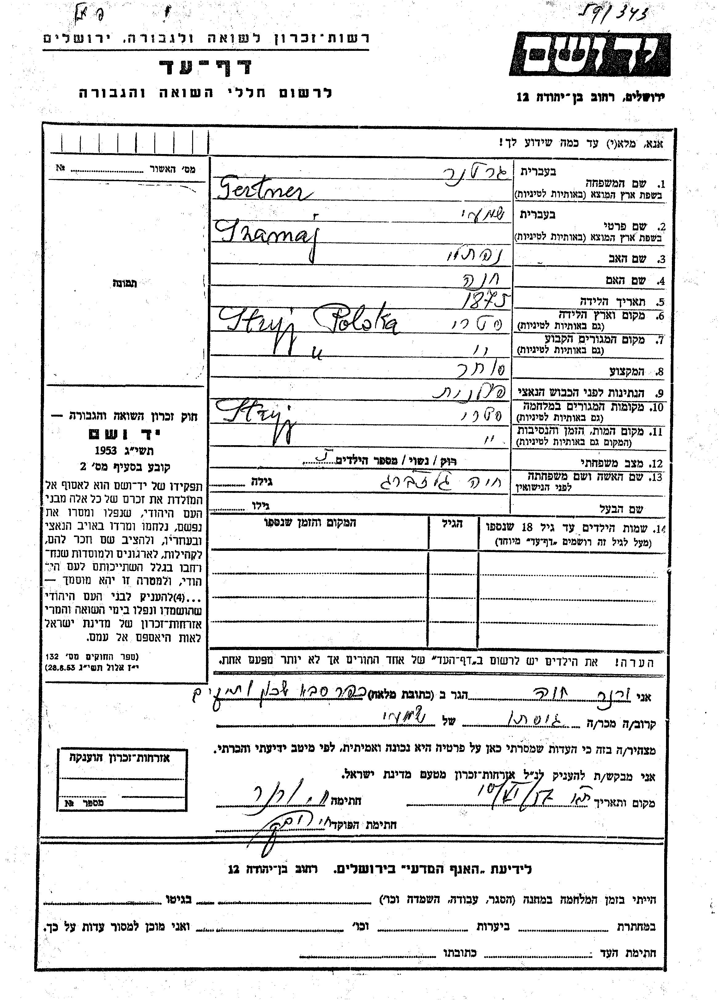 Gertner Szamaj 1875 Stryj, Poland Page of Testimony