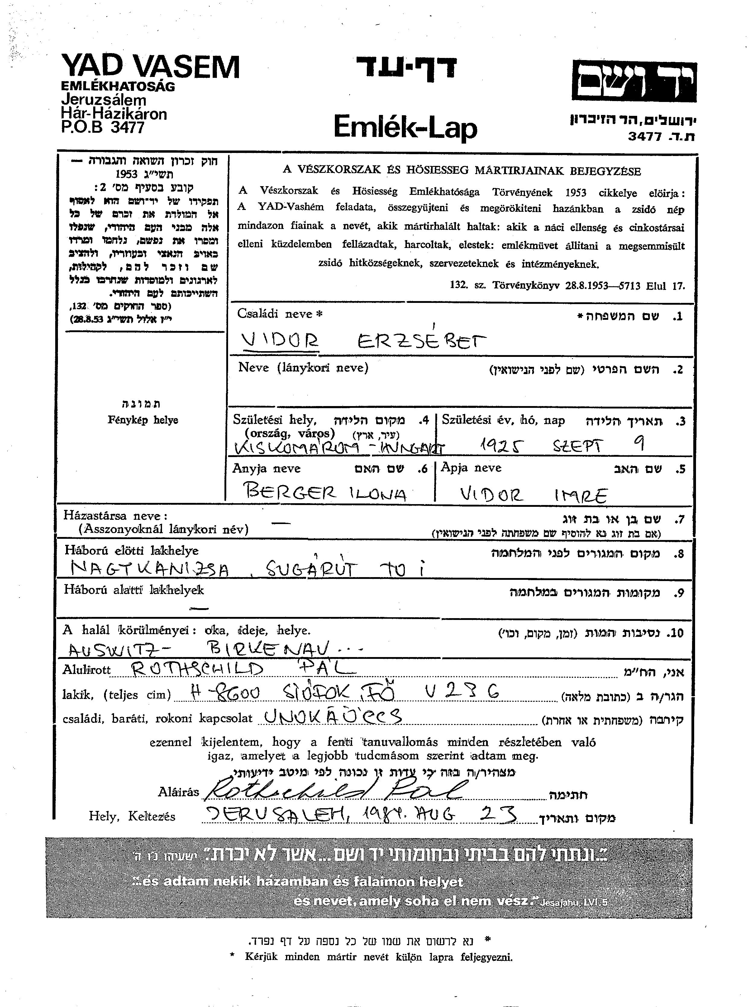 Vidor | Erzsébet | 1925 | Nagy Kanizsa, Hungary | Page of Testimony |