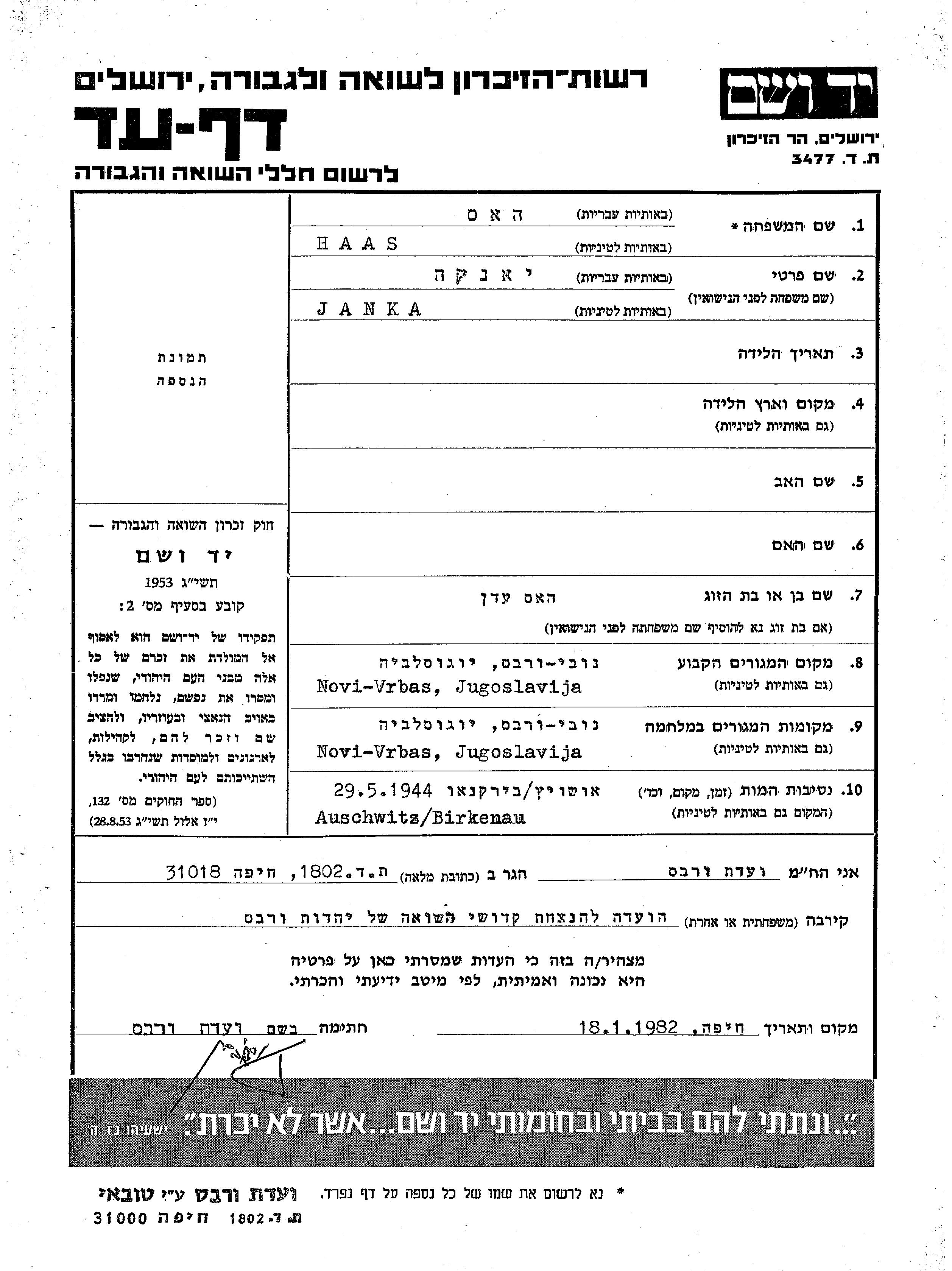 Haas Janka Novi Vrbas, Yugoslavia Page of Testimony