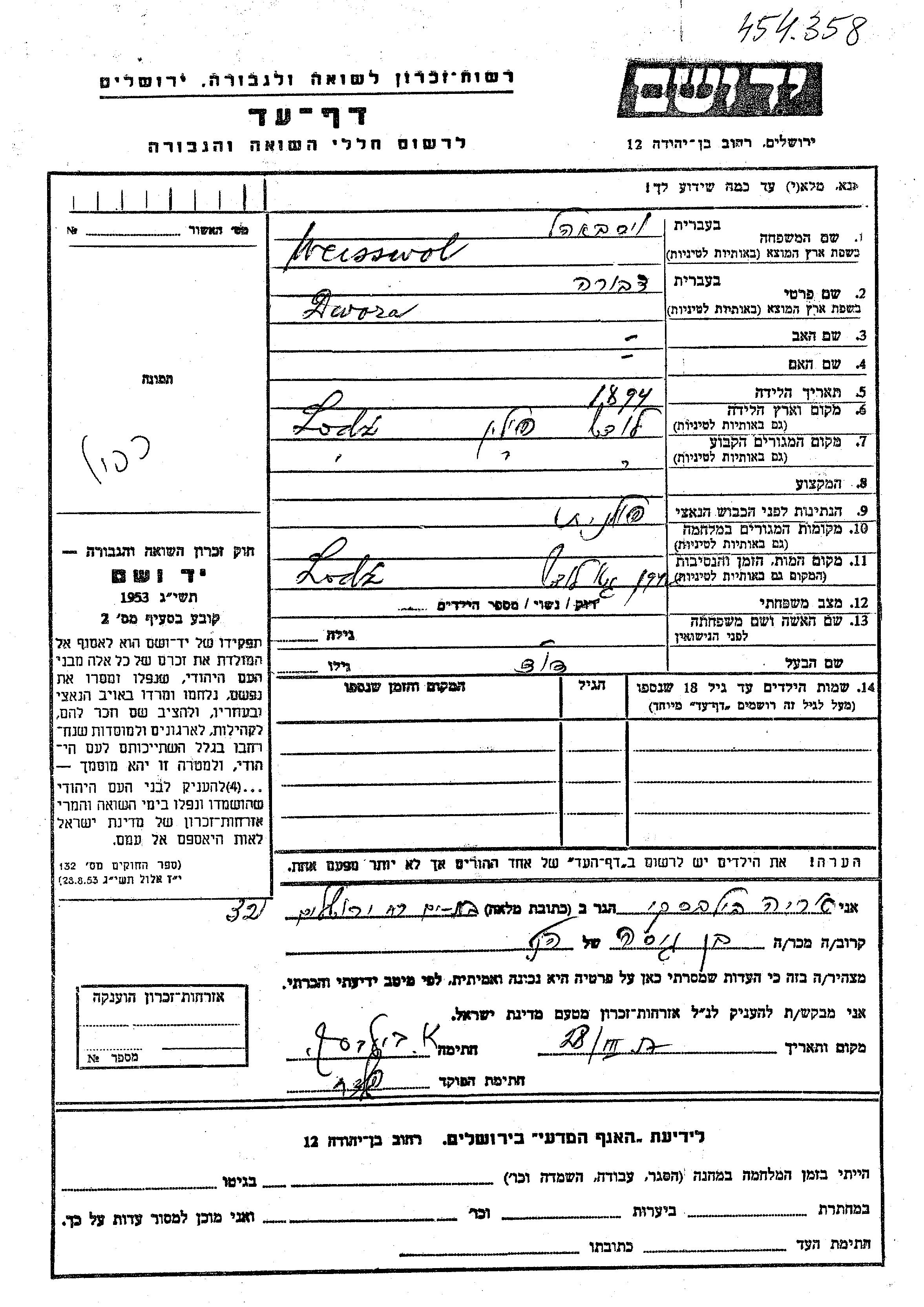 Weisswol Dwora 1894 Lodz, Poland Page of Testimony