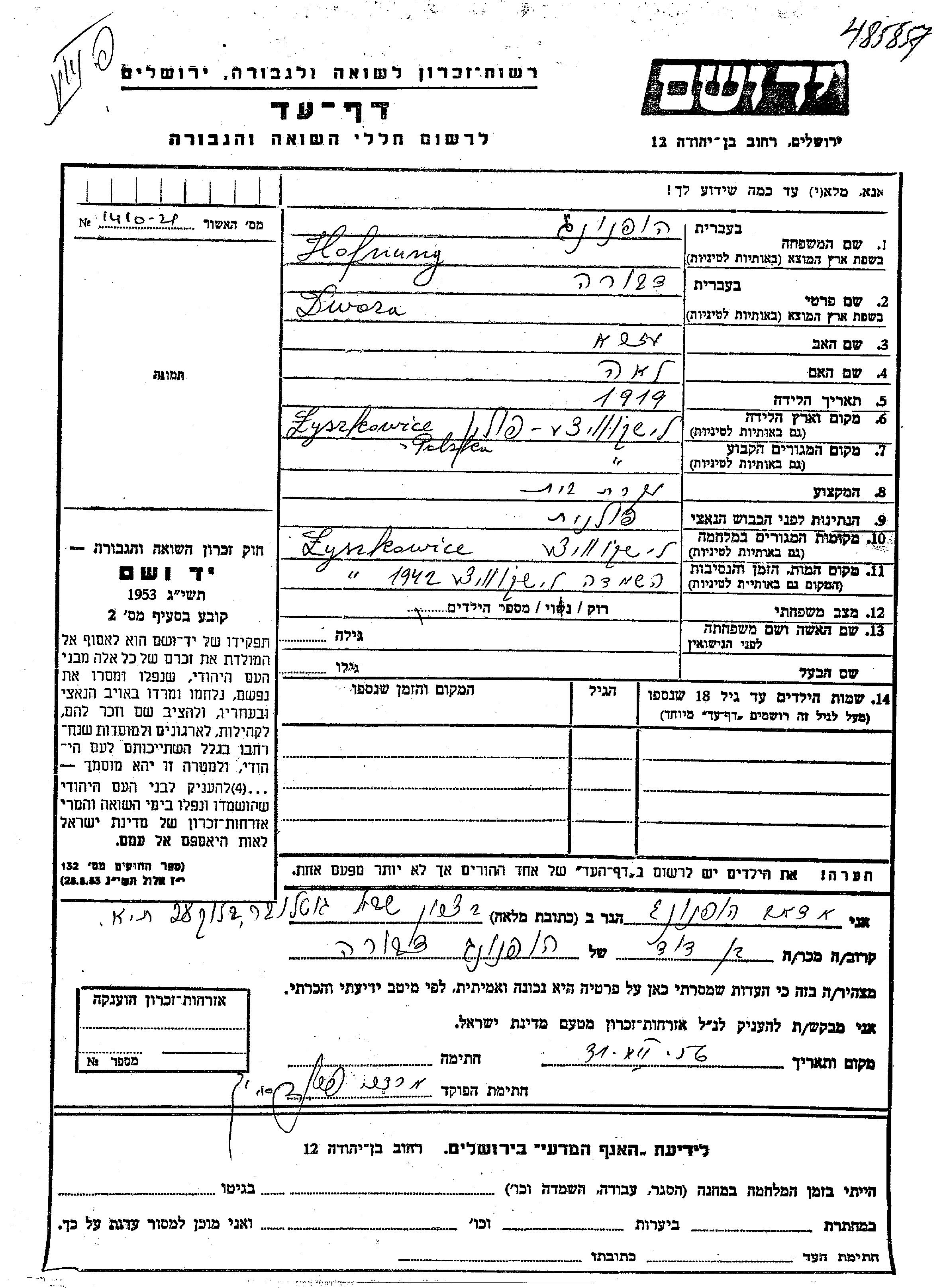 Dwora Hofnung was born in Lyszkowice, Poland, 1919 to Ezra and Lea. She was a housewife and married. Prior to WWII she lived in Lyszkowice, Poland. During the war she was in Lyszkowice, Poland. Dwora was murdered in the Shoah. Place of death: Lyszkowice, Poland, 1942.
