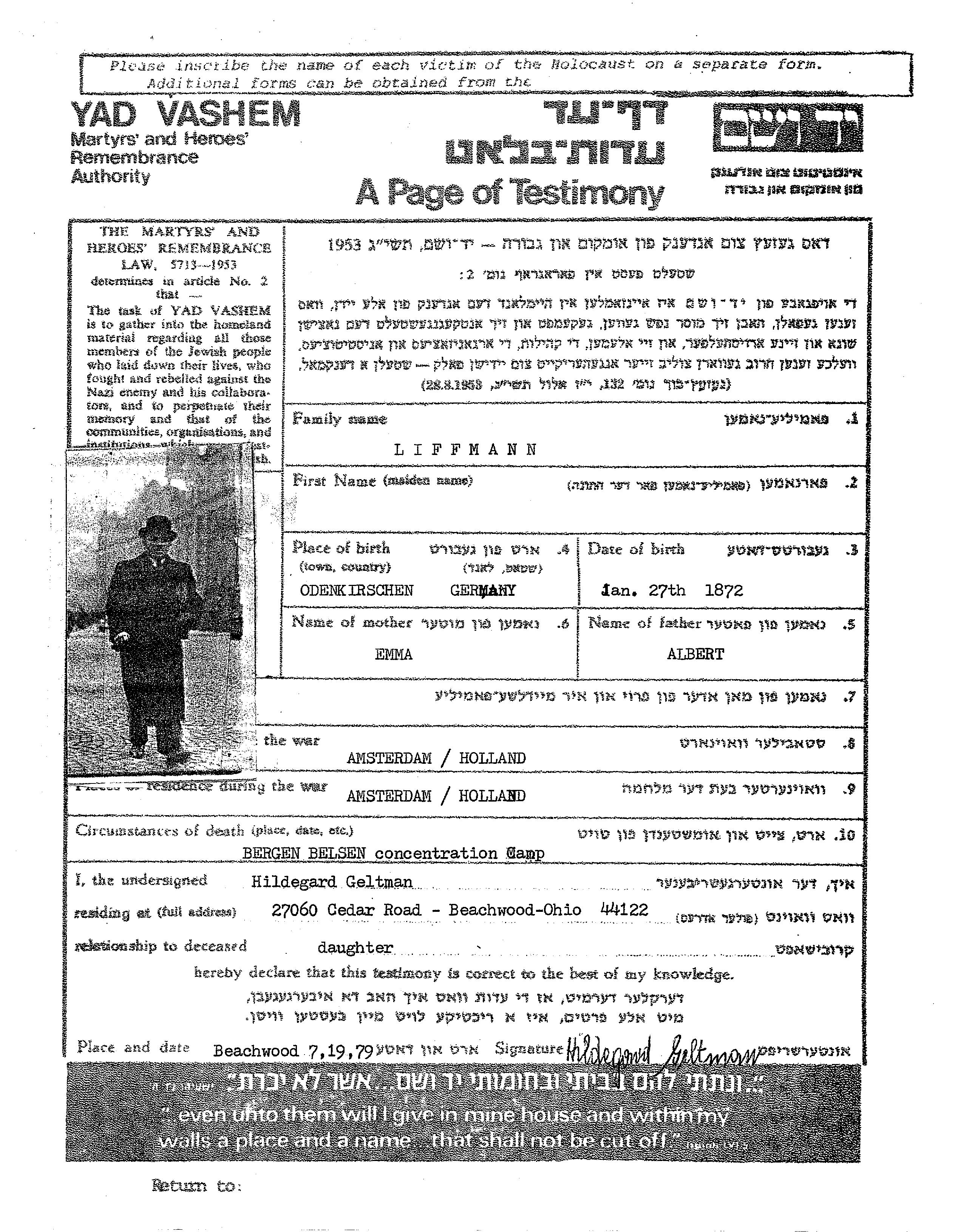 First name unknown Liffmann was born in Odenkirchen, Germany, 1872 to Albert and Emma. Prior to WWII he lived in Amsterdam, The Netherlands. During the war he was in Amsterdam, The Netherlands. He was murdered in the Shoah. Place of death: Bergen Belsen, Germany.