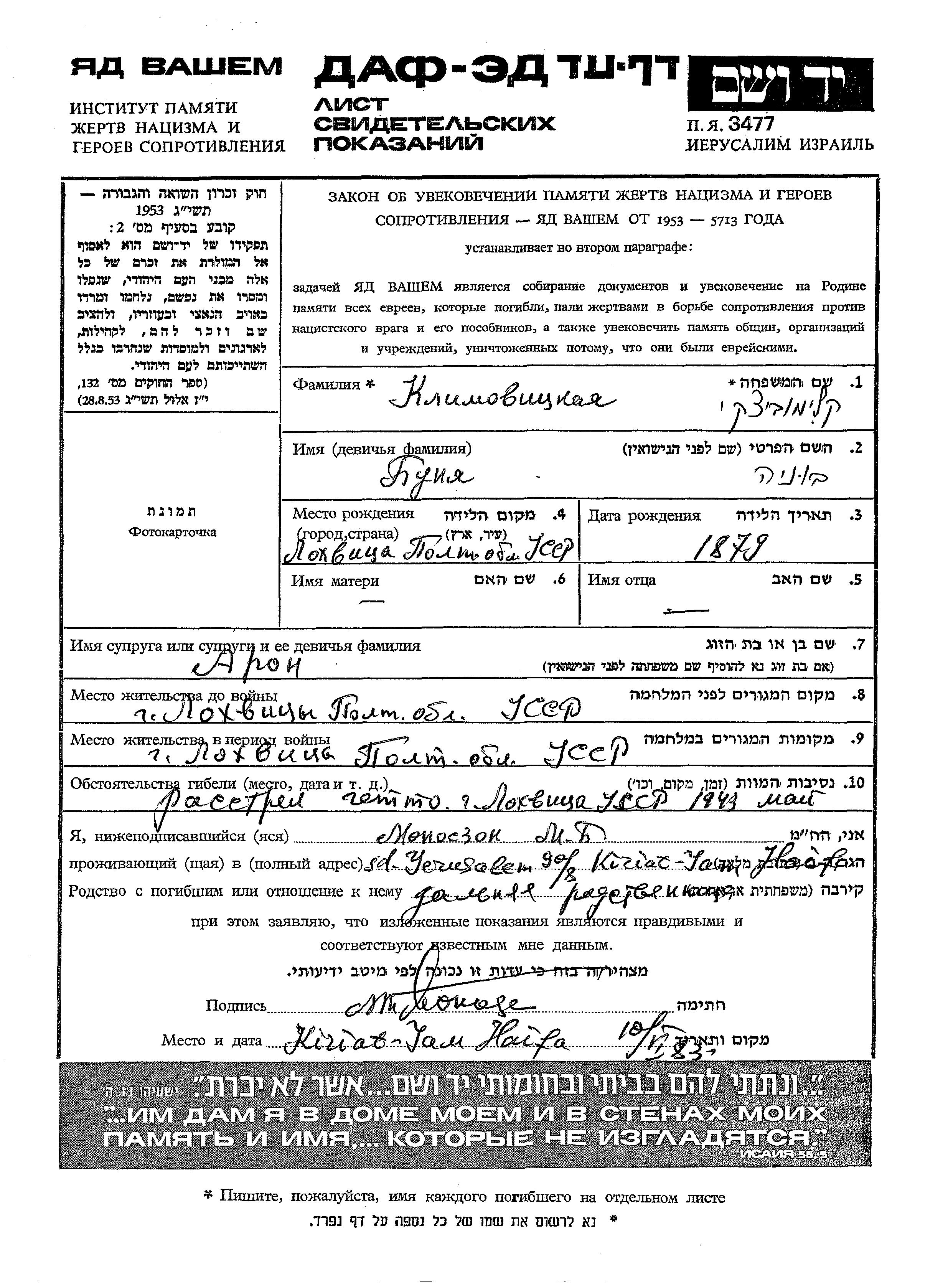 Klimovitzki Bunya 1879 Lokhvitsa, Ukraine (USSR) Page of Testimony