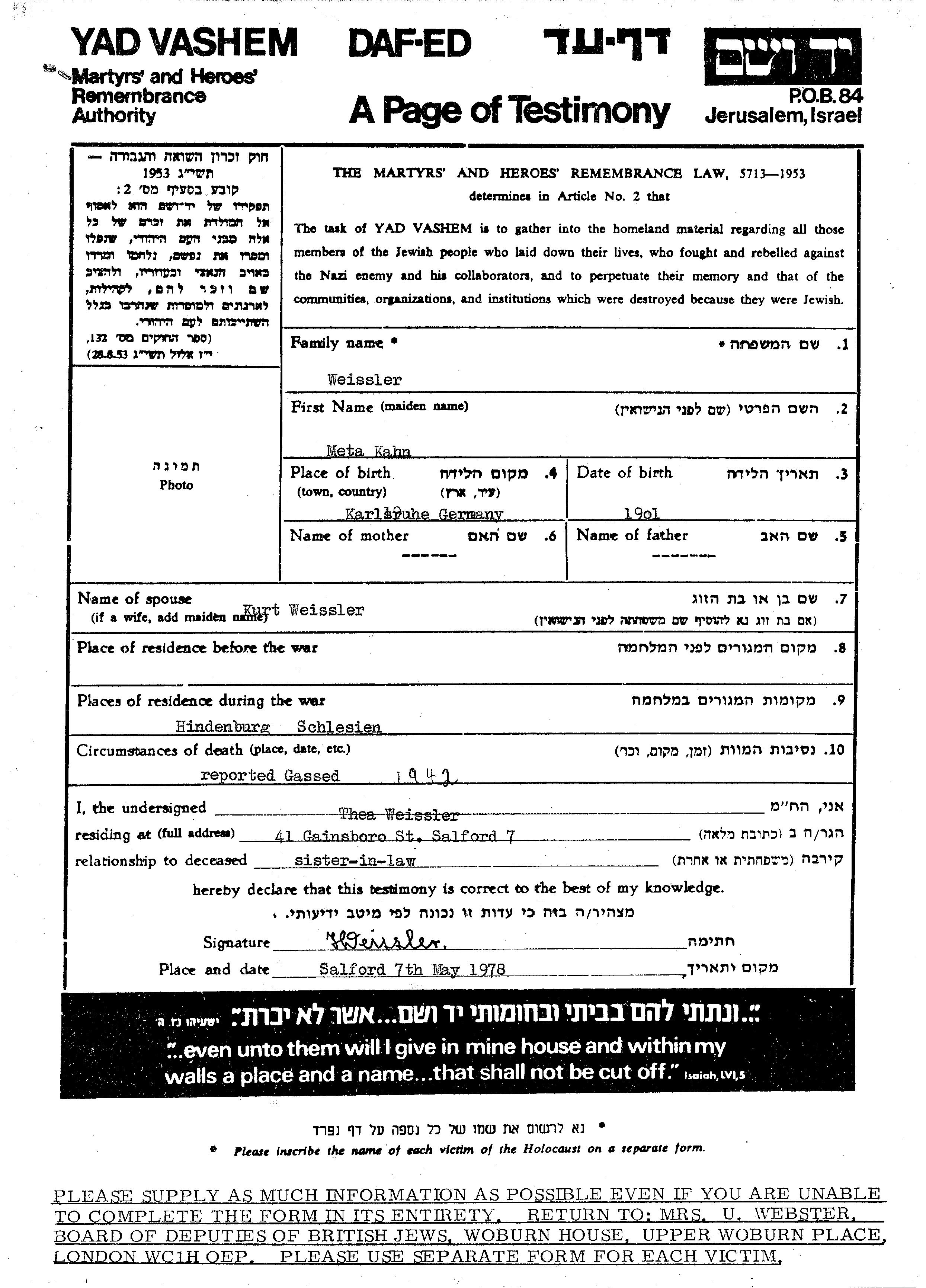 Meta Weissler nee Kahn was born in Karlsruhe, Germany, 1901. She was married to Kurt. During the war she was in Hindenburg, Germany.