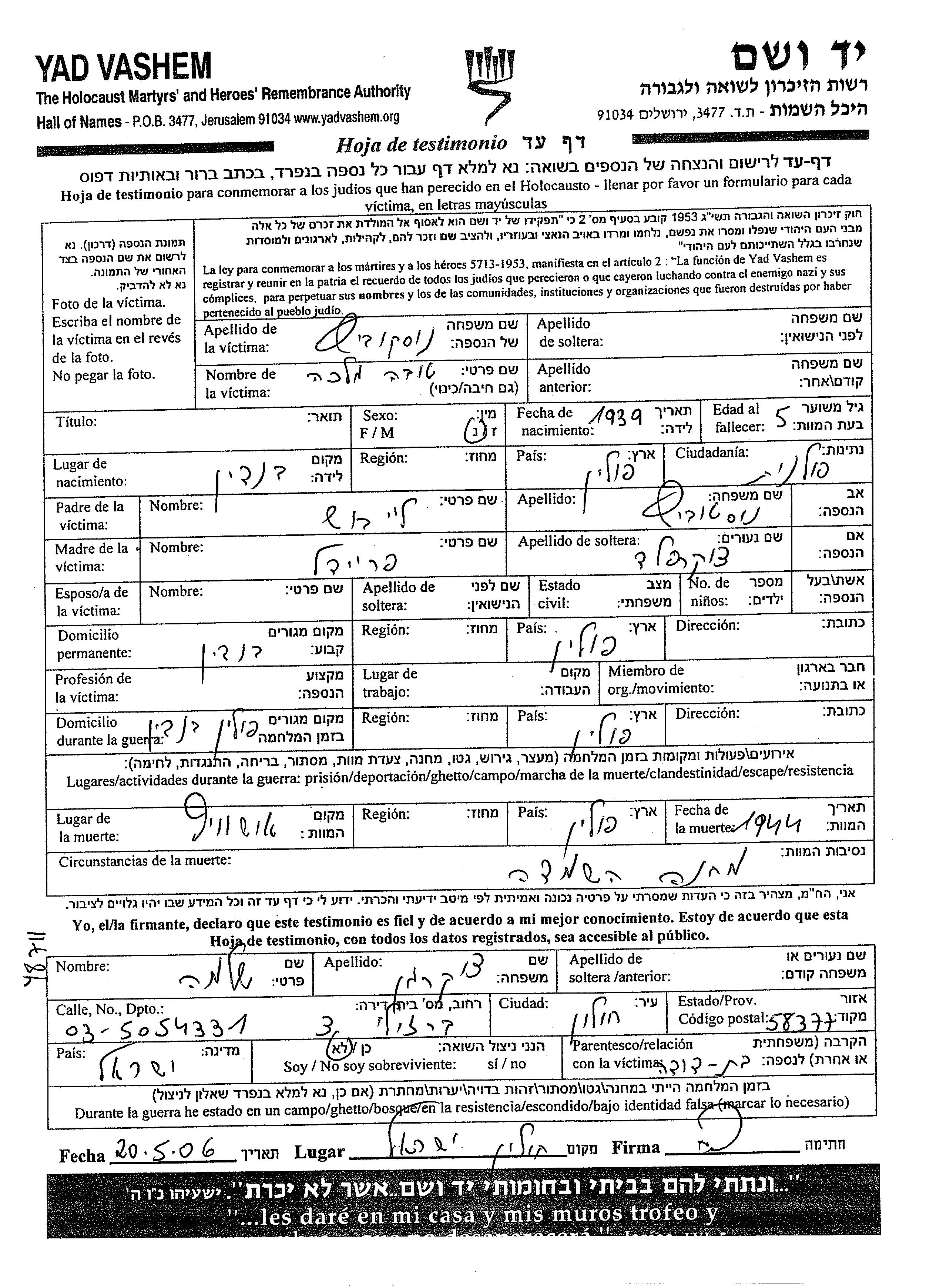 Yad Vashem - Pages of Testimony Names Memorial Collection