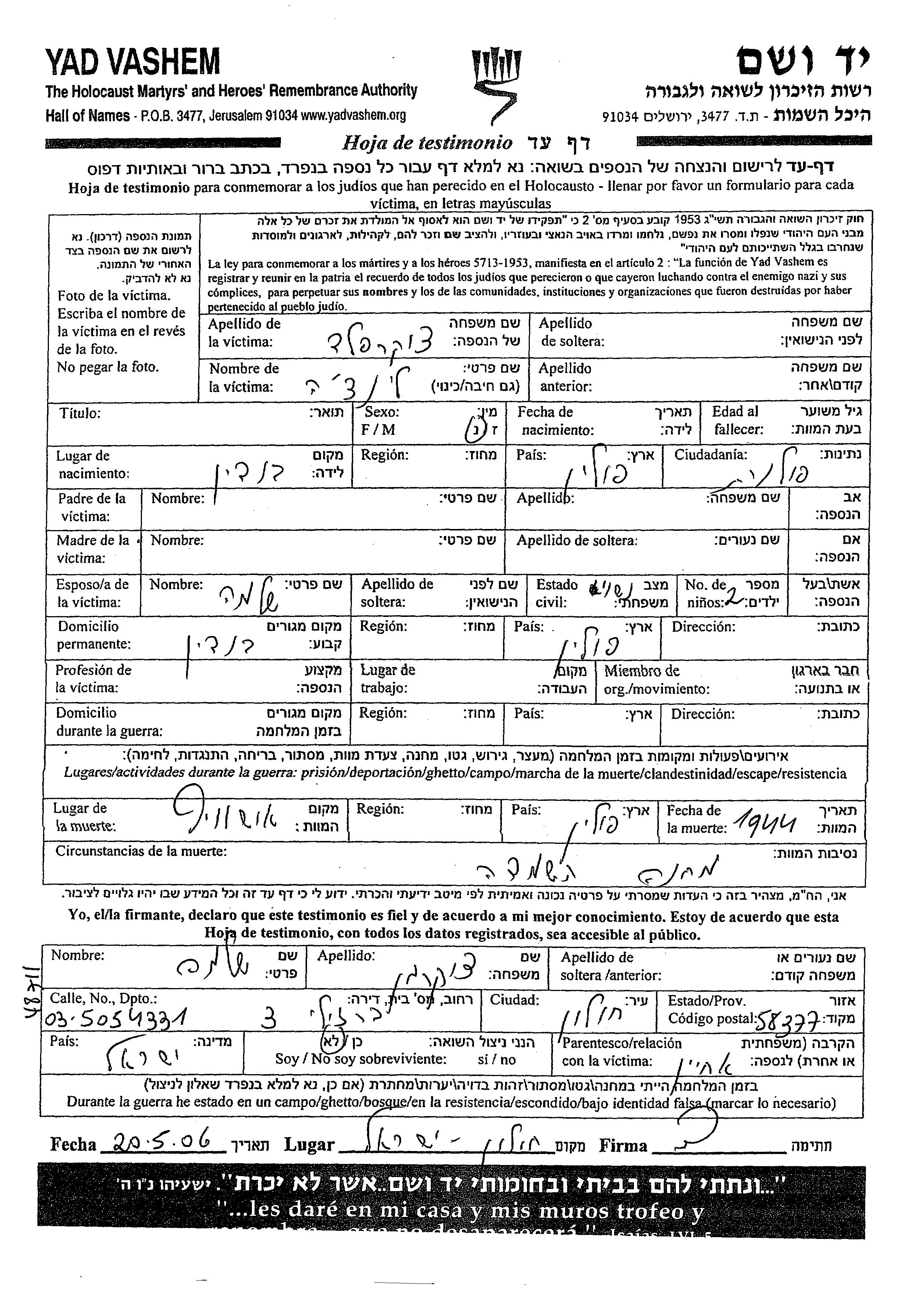 Yad Vashem - Pages of Testimony Names Memorial Collection
