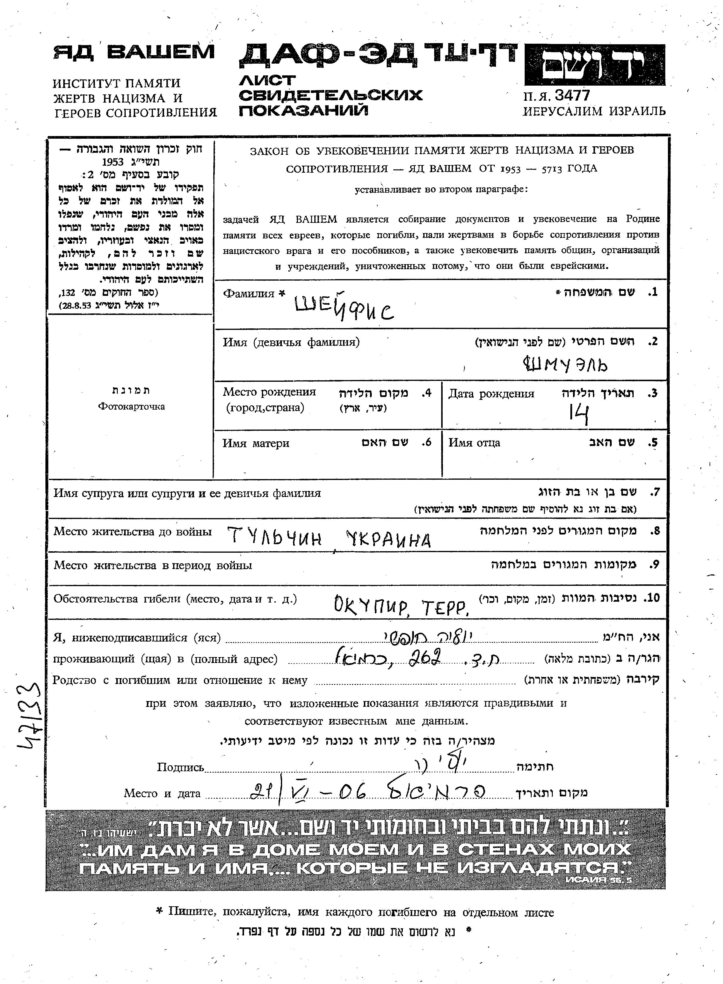 Sheifis Shmuel Tulchin, Ukraine (USSR) Page of Testimony