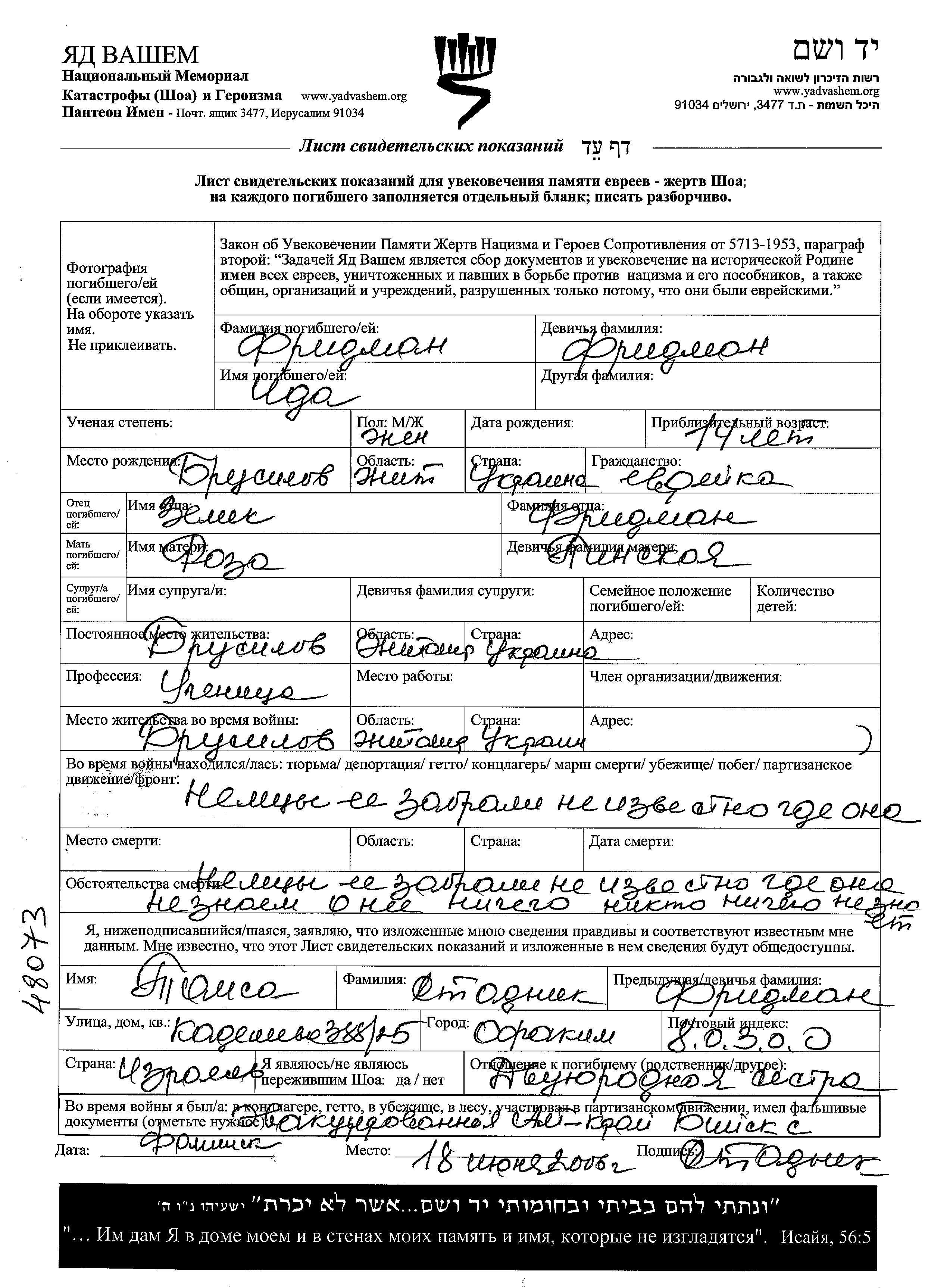 Ida Fridman was born in Brusilov, Ukraine (USSR) to Zelik and Roza nee Pinskaya. She was a pupil and child. Prior to WWII she lived in Brusilov, Ukraine (USSR). During the war she was in Brusilov, Ukraine (USSR). Ida was murdered in the Shoah.