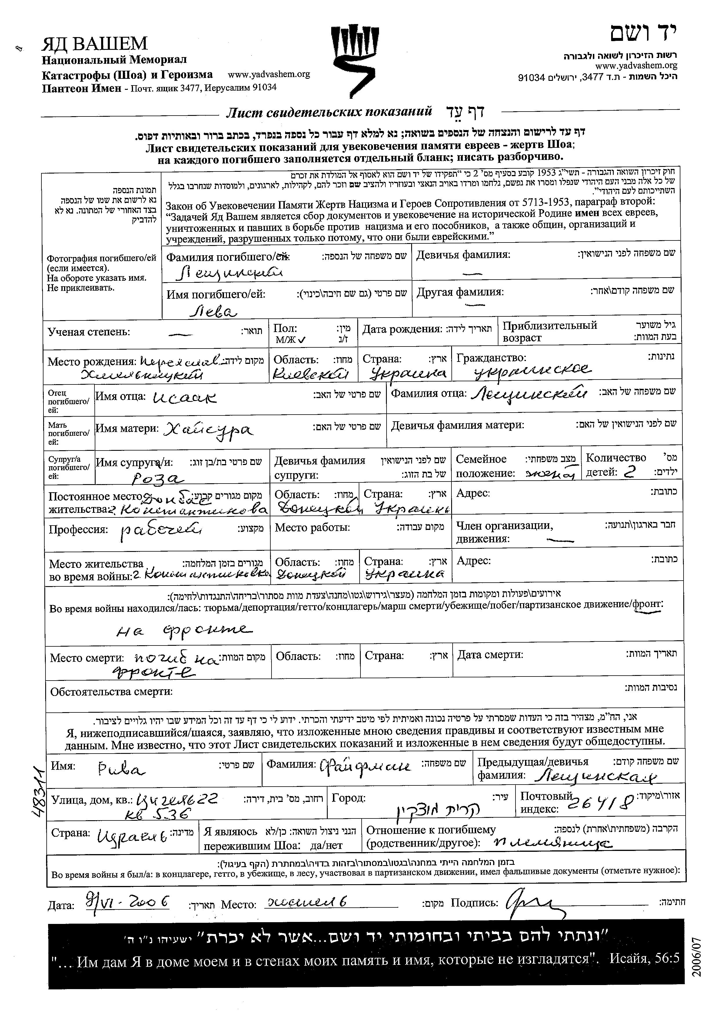 Leva Leshchinski was born in Pereyaslav Khmelnitski, Ukraine (USSR) to Isaak and Khai. He was a worker and married to Roza. Prior to WWII he lived in Konstantinovka, Ukraine (USSR). During the war he was in the Soviet armed forces. Leva was killed in military service in WWII.