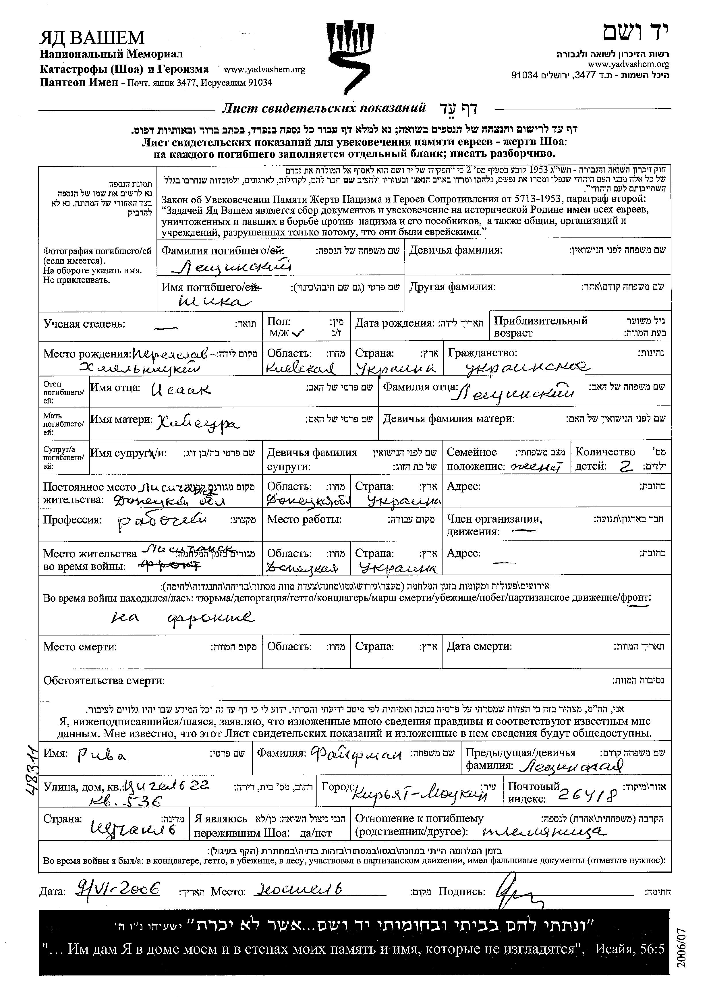Shika Leshchinski was born in Pereyaslav Khmelnitski, Ukraine (USSR) to Isaak and Khai. He was a worker and married. Prior to WWII he lived in Lisichansk, Ukraine (USSR). During the war he was in Lisichansk, Ukraine (USSR). Shika was killed in military service in WWII. Place of death: the Soviet armed forces.