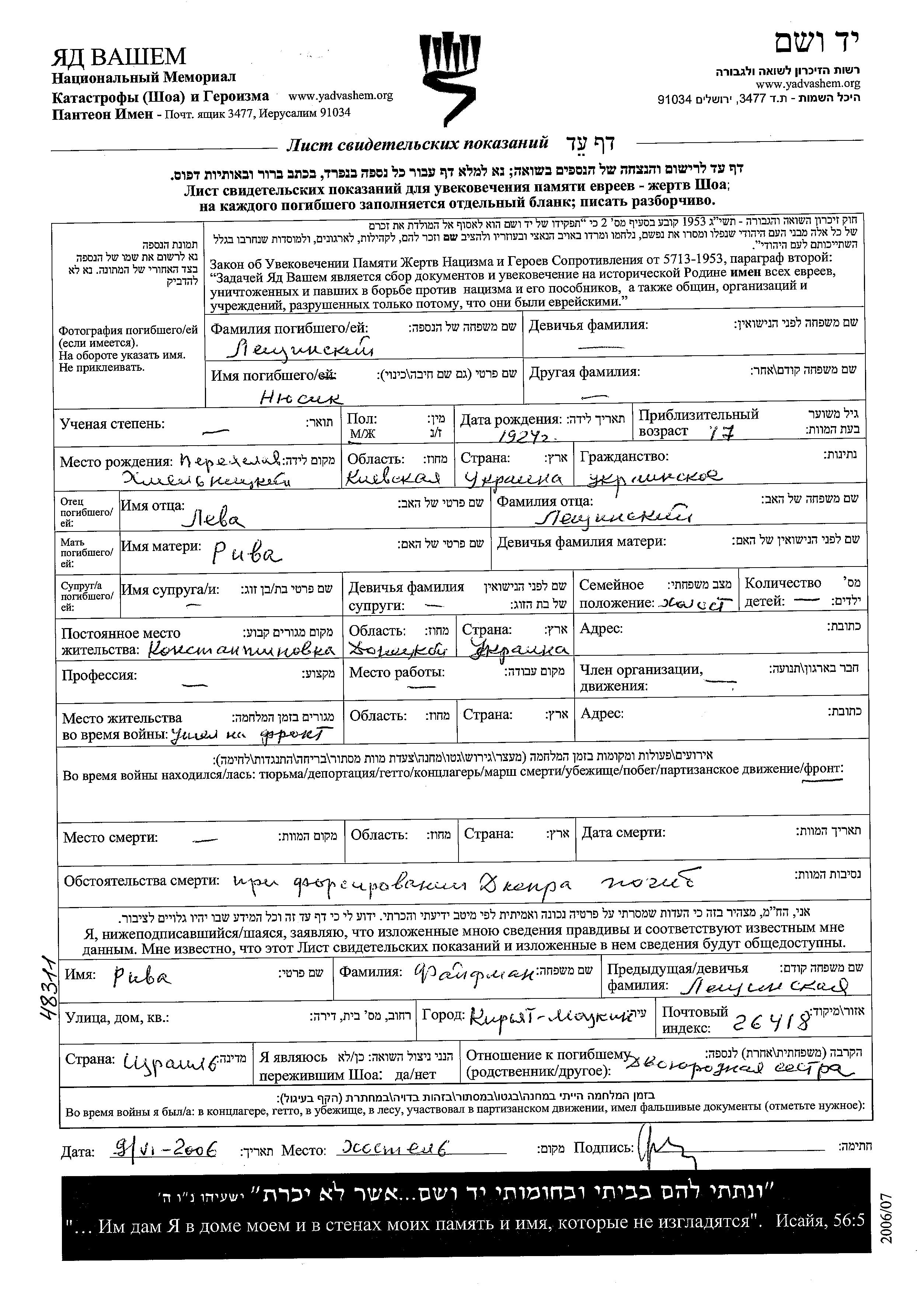 Nyusik Leshchinski was born in Pereyaslav Khmelnitski, Ukraine (USSR) to Leva and Riva. He was single. Prior to WWII he lived in Konstantinovka, Ukraine (USSR). During the war he was in the Soviet armed forces. Nyusik was killed in military service in WWII.