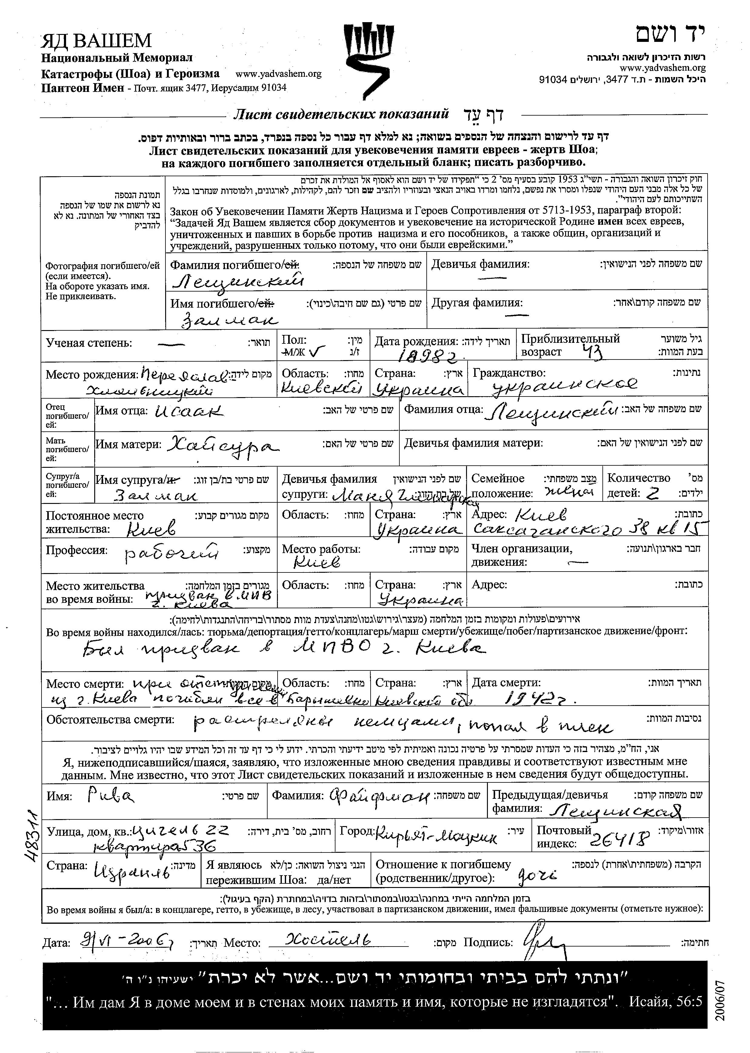 Zalman Leshchinski was born in Pereyaslav Khmelnitski, Ukraine (USSR), 1898 to Isaak and Khai. He was a worker and married to Manya nee Glinarskaya. Prior to WWII he lived in Kiev, Ukraine (USSR). During the war he was in Kiev, Ukraine (USSR). Zalman was murdered in the Shoah. Place of death: Baryshevka, Ukraine (USSR), 1942.