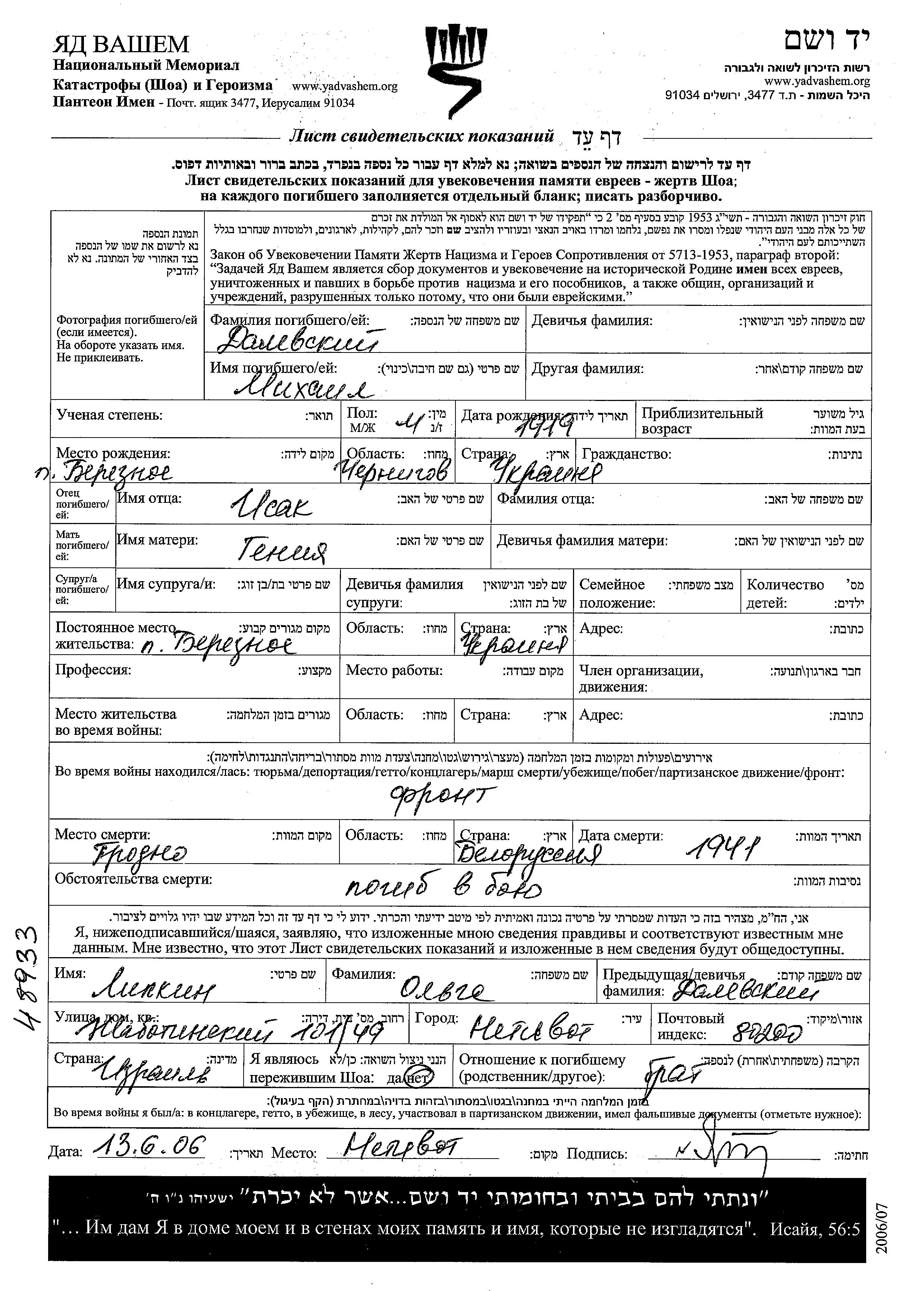 Mikhail Dalevski was born in Berezna, Ukraine (USSR), 1919 to Isak and Genya. He was single. Prior to WWII he lived in Berezna, Ukraine (USSR). During the war he was in the Soviet armed forces. Mikhail was killed in military service in WWII. Place of death: Grodno, Poland, 1941.